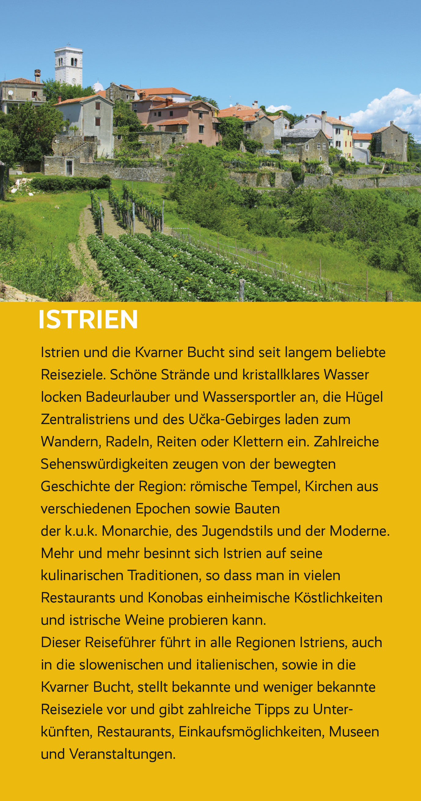 Die Vielfalt der größten Adria-Halbinsel gibt der Trescher-Reiseführer ISTRIEN umfassend wieder. Alle Sehenswürdigkeiten und eine Fülle an Freizeitmöglichkeiten werden beschrieben. Vertiefende Hintergrundinformationen widmen sich der Geschichte und Kultur, den Traditionen und dem Alltag von Land und Leuten. Mit Empfehlungen zu Weingütern, Restaurants und den landestypischen kleinen Konobas, dazu ausgesuchten Vorschlägen für die Unterkunft sowie zahlreichen reisepraktischen Tipps hilft das handliche Buch dabei, sämtliche istrischen Traumreiseziele für sich zu entdecken.