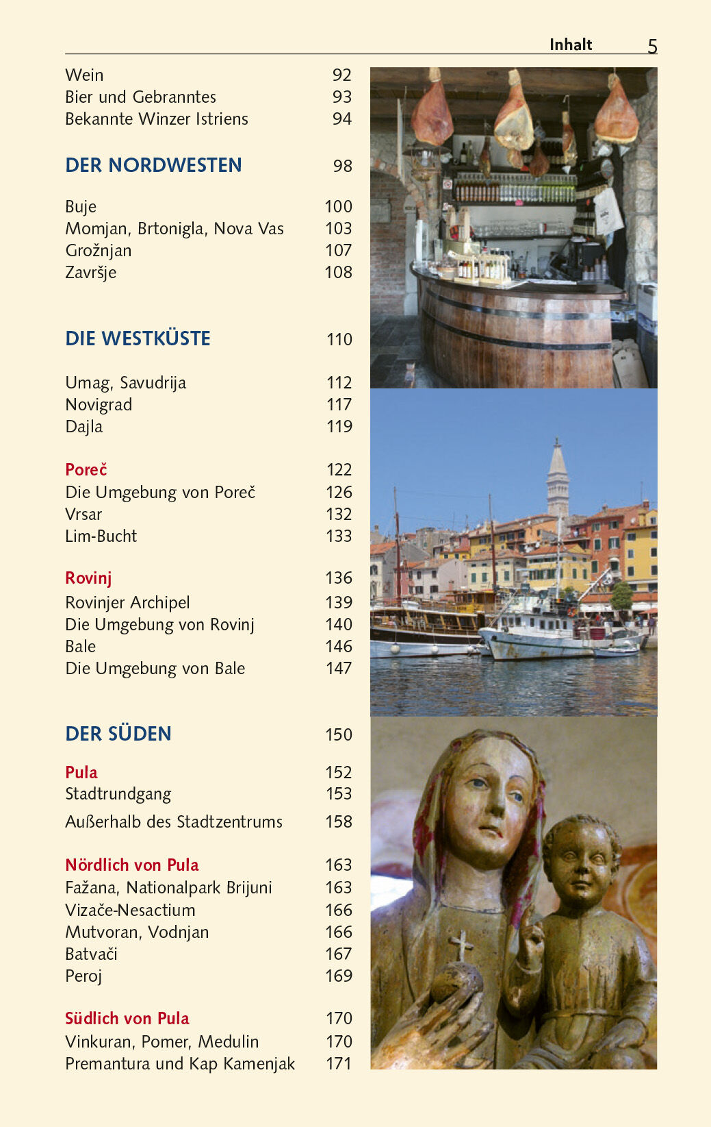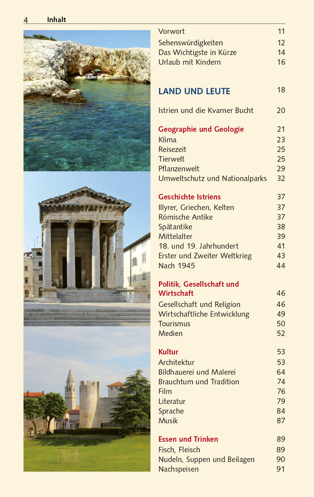 Vorwort 11 Sehenswürdigkeiten 12 Das Wichtigste in Kürze 14 Urlaub mit Kindern 16 LAND UND LEUTE 18 Istrien und die Kvarner Bucht 20 Geographie und Geologie 21 Klima 23 Reisezeit 25 Tierwelt 25 Pflanzenwelt 29 Umweltschutz und Nationalparks 32 Geschichte Istriens 37 Illyrer, Griechen, Kelten 37 Römische Antike 37 Spätantike 38 Mittelalter 39 18. und 19. Jahrhundert 41 Erster und Zweiter Weltkrieg 43 Nach 1945 44 Politik, Gesellschaft und Wirtschaft 46 Gesellschaft und Religion 46 Wirtschaftliche Entwicklung 49 Tourismus 50 Medien 52 Kultur 53 Architektur 53 Bildhauerei und Malerei 64 Brauchtum und Tradition 74 Film 76 Literatur 79 Sprache 84 Musik 87 Essen und Trinken 89 Fisch, Fleisch 89 Nudeln, Suppen und Beilagen 90 Nachspeisen 91 Wein 92 Bier und Gebranntes 93 Bekannte Winzer Istriens 94 DER NORDWESTEN 98 Buje 100 Momjan, Brtonigla, Nova Vas 103 Gronjan 107 Zavrje 108 DIE WESTKÜSTE 110 Umag, Savudrija 112 Novigrad 117 Dajla 119 Pore 122 Die Umgebung von Pore 126 Vrsar 132 Lim-Bucht 133 Rovinj 136 Rovinjer Archipel 139 Die Umgebung von Rovinj 140 Bale 146 Die Umgebung von Bale 147 DER SÜDEN 150 Pula 152 Außerhalb des Stadtzentrums 158 Nördlich von Pula 163 Faana 163 Nationalpark Brijuni 163 Vizae-Nesactium 166 Mutvoran, Vodnjan 166 Batvai 167 Peroj 169 Südlich von Pula 170 Vinkuran, Pomer, Medulin 170 Premantura und Kap Kamenjak 170 ZENTRALISTRIEN 174 Pazin 176 Die Umgebung von Pazin 180 Beram 180 Trvi 180 Wasserfall Zareki krov 180 Cerovlje 180 Gologorica 181 Sv. Kri 181 Zelengrad 181 Grimalda, Dragu 182 Borut 183 Paz und Belaj, Boljun 183 Lindar, Graie 184 Pian, Tinjan, Kringa 185 Sv. Petar u umi 186 DER NORDOSTEN 188 Buzet 191 Raice 191 Hum 192 Kotli, Ro 193 Pietropelosa-Kosmati 197 Sale, trped 197 Sovinjak 197 iarija 198 Motovun 201 Livade 201 Viinada 203 Boje polje 205 Rakotule 205 Oprtalj 205 Istarske Toplice 205 Zamask 206 DIE OSTKÜSTE 208 Labin 210 Podlabin und Raa 212 Rabac, Barban 213 Halbinsel Koromano 214 Plomin 216 Kran 216 Liburnische Riviera 217 Brse 217 Moenice 218 Medveja 218 Lovran 218 OPATIJA UND RIJEKA 222 Opatija 224 Lungomare 225 Naturpark Uka 225 Rijeka 230 Kastav 236 Gorski Kotar und Nationalpark Risnjak 237 Die Riviera von Rijeka 241 Bakar 241 Hreljin, Kraljevica 243 Crikvenica 245 Das Vinodol 249 Drivenik 249 Griane-Belgrad 249 Bribir 250 Oi Vinodola 250 Novi Vinodolski 251 Senj 254 Festung Nehaj 256 Die Umgebung von Senj 257 Nationalpark Nord-Velebit 259 DIE INSELN DER KVARNER BUCHT 260 Kvarner Bucht 262 Insel Krk 264 Der Norden 266 Der Westen 269 Der Osten 271 Stadt Krk 275 Die Umgebung von Krk-Stadt 278 Der Süden 282 Insel Cres 290 Porozina 290 Beli 291 Stadt Cres 293 Valun 294 Lubenice 295 Martinica, Osor 295 Punta Kria 297 Insel …