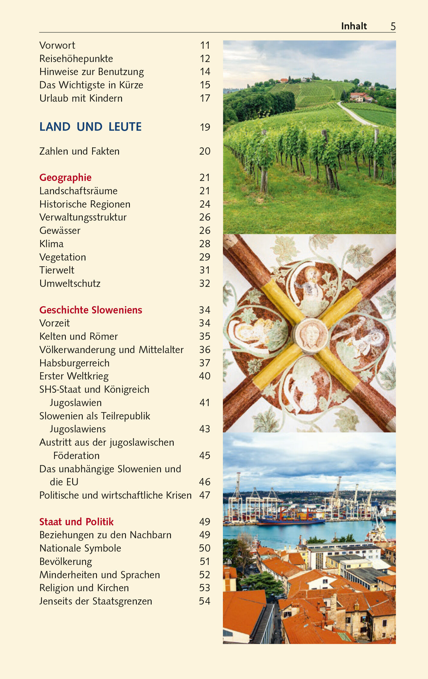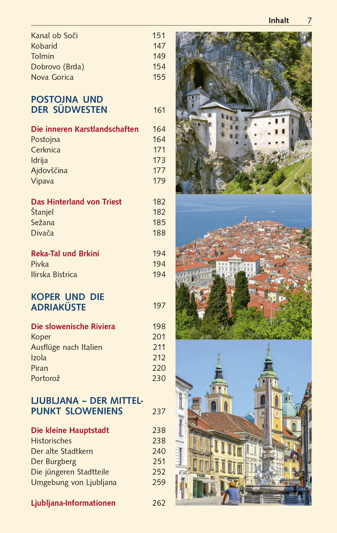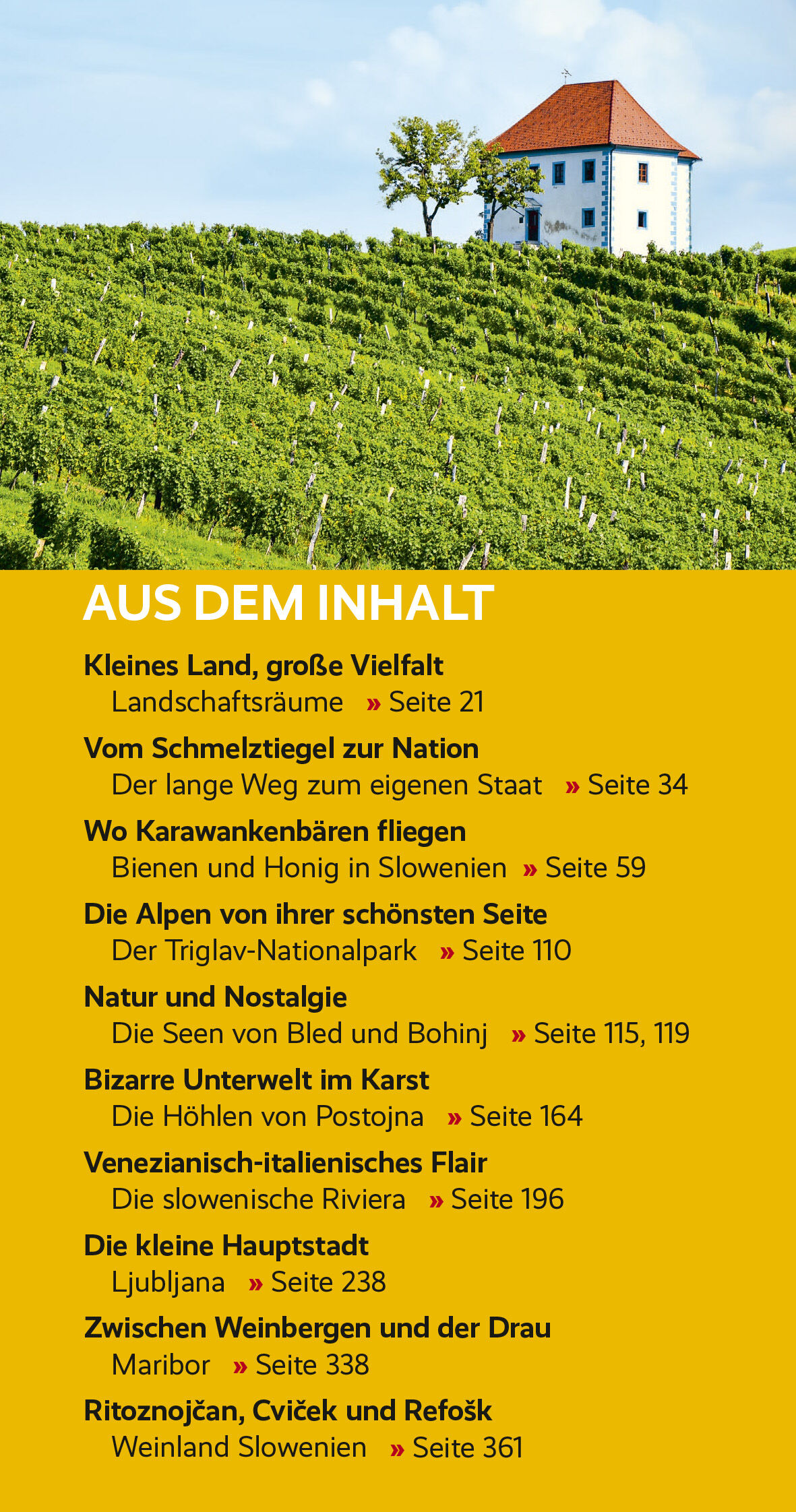Seite 21 VOM SCHMELZTIEGEL ZUR NATION Der lange Weg zum eigenen Staat > Seite 34 WO KARAWANKENBÄREN FLIEGEN Bienen und Honig in Slowenien > Seite 59 DIE ALPEN VON IHRER SCHÖNSTEN SEITE Der Triglav-Nationalpark > Seite 110 NATUR UND NOSTALGIE Die Seen von Bled und Bohinj > Seite 115, 119 BIZARRE UNTERWELT IM KARST Die Höhlen von Postojna > Seite 165 VENEZIANISCH-ITALIENISCHES FLAIR Die slowenische Riviera > Seite 190 DIE KLEINE HAUPTSTADT Ljubljana > Seite 238 ZWISCHEN WEINBERGEN UND DER DRAU Maribor > Seite 338 RITOZNOJAN, CVIEK UND REFOK Weinland Slowenien > Seite 361 Slowenien, der viertkleinste unter allen EU-Staaten, bietet eine überraschende Vielfalt an landschaftlichen und kulturellen Eindrücken: Alpine Gipfel, Almen, Wälder, Weinberge, Flusstäler, Höhlen, Schlösser, Burgen, Kirchen, Klöster, historische Stadtbilder und nicht zuletzt auch 47 Kilometer eigene Adriaküste. Habsburgische und venezianische Einflüsse und Eigenheiten sowie die Zugehörigkeit zum jugoslawischen Bundesstaat haben das liebenswerte und völlig unkomplizierte Reiseland geprägt. Dieses Buch vereinigt landeskundliche und historische Hintergründe mit aktuellen Reiseinformationen. Alle Regionen Sloweniens werden mit ihren Sehenswürdigkeiten und Naturschönheiten ausführlich vorgestellt. >>> Reiseführer zu weiteren Zielen in Südosteuropa und Österreich finden Sie auf der Website des Trescher Verlags