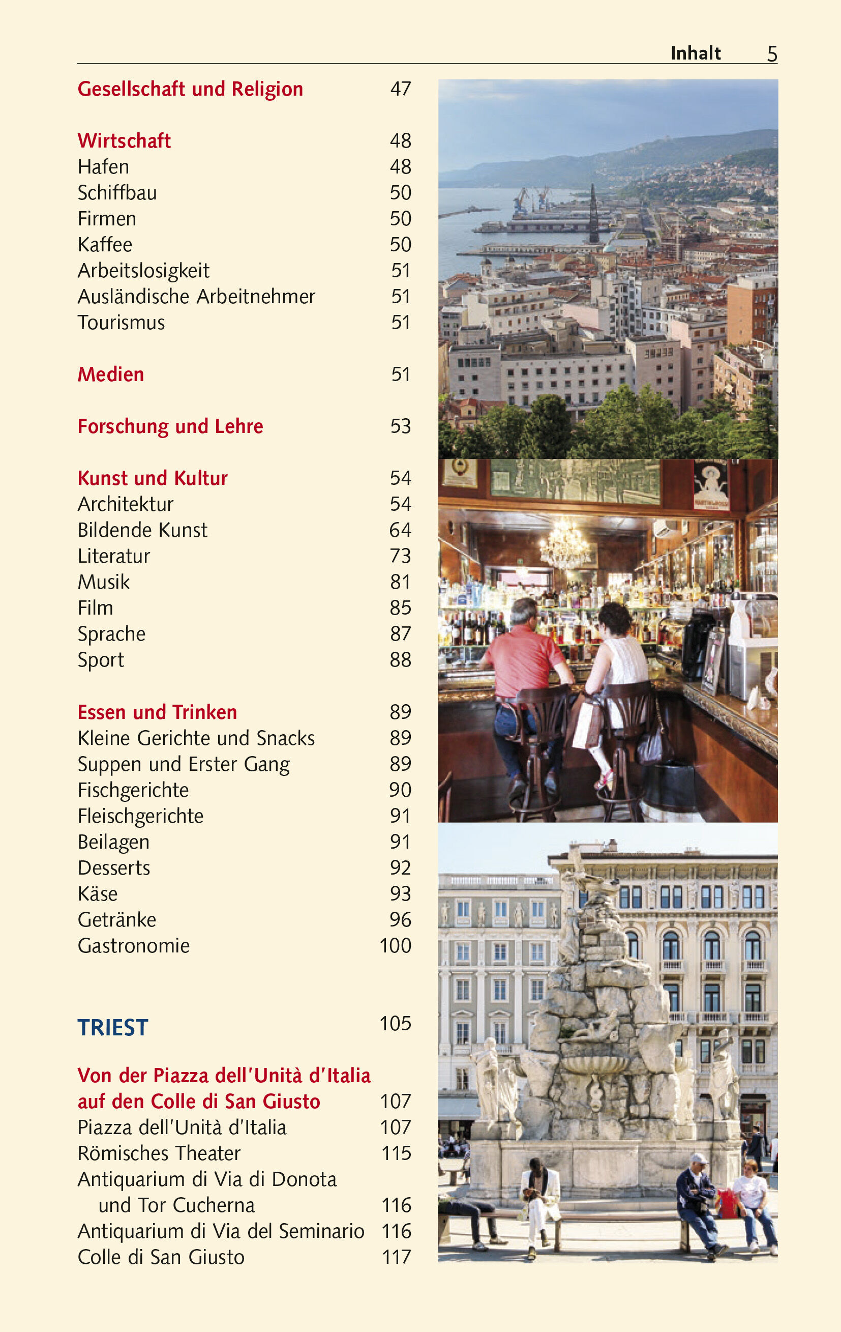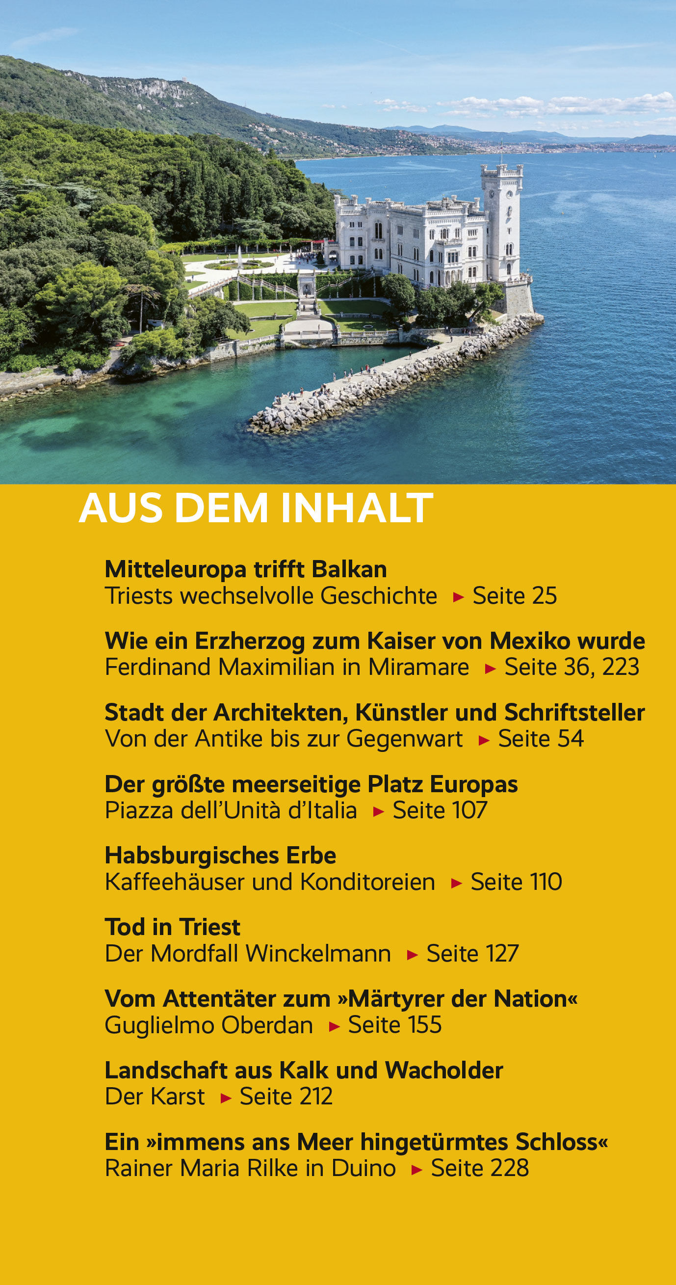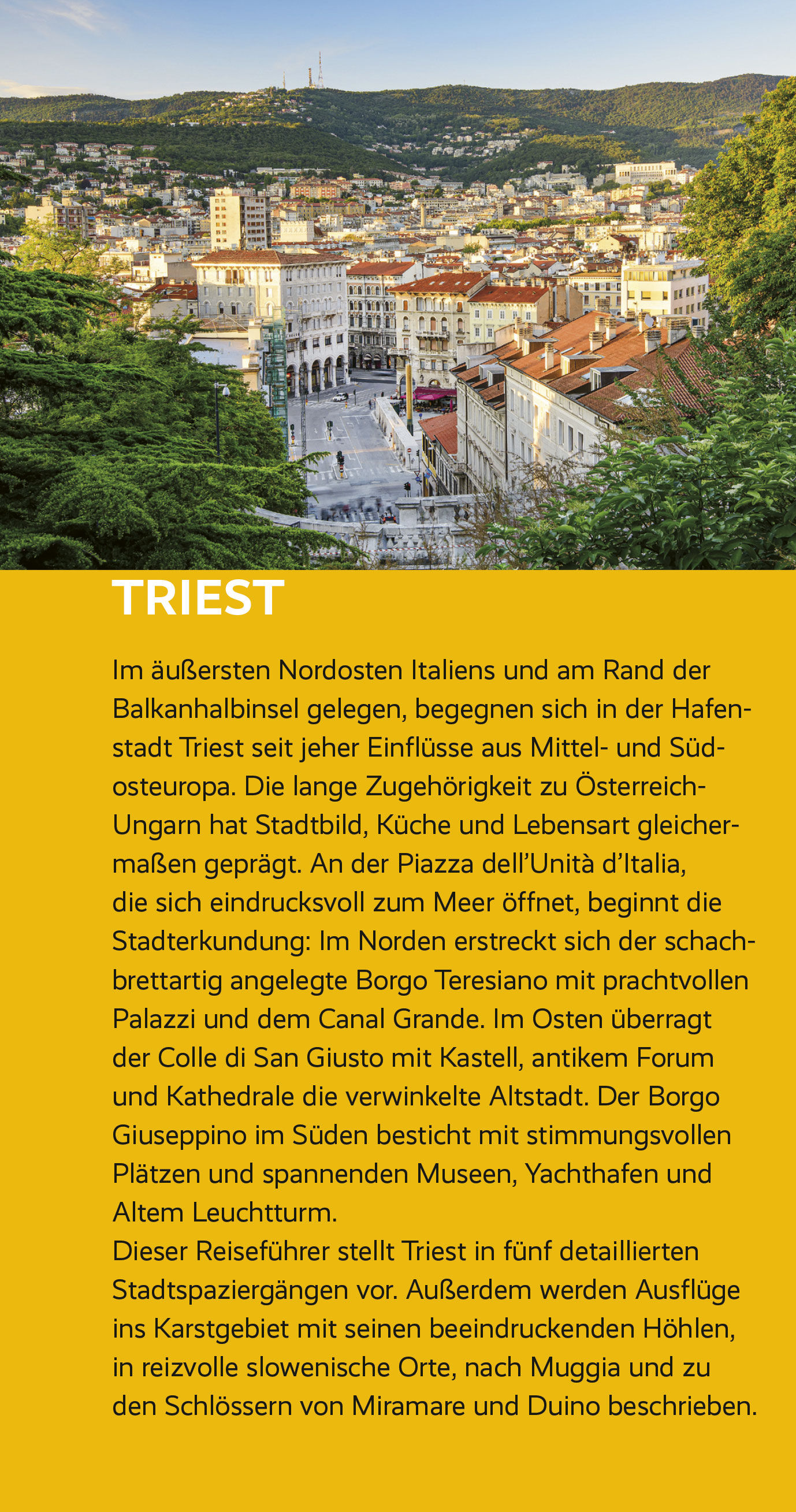 Auf ausführlichen Stadtspaziergängen geleitet der Reiseführer zu sämtlichen Sehenswürdigkeiten: von der monumentalen Piazza dell'Unità d'Italia zum Colle di San Giusto, auf dem Kastell und Kathedrale über der Altstadt thronen; durch den schachbrettartigen Borgo Teresiano zum malerischen Canal Grande; entlang der Uferpromenade vom Alten Hafen zum Molo Audace und zu den Badeanstalten. Ausflüge gehen ins Karstgebiet, dessen spröde Landschaft aus Kalk und Wacholder, steilen Felswänden, Dolinen und Höhlen zum Wandern und Klettern einlädt. Der Fischerort Muggia, das Habsburgerschloss Miramare und Schloss Duino sind weitere spektakuläre Ausflugsziele. Abstecher führen außerdem in reizvolle slowenische Orte wie tanjel oder Lipica, Heimat der schneeweißen Lipizzanerpferde.