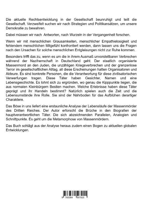 Das vorliegende Buch möchte das Phänomen "Des Bösen in uns" ergründen. Ausgehend von einem philosophischen Exkurs über das Böse wird anhand der Analyse der Lebensläufe der vier NS- Massenmörder Heinrich Himmler, Reinhard Heydrich, Adolf Eichmann und Rudolf Höß...