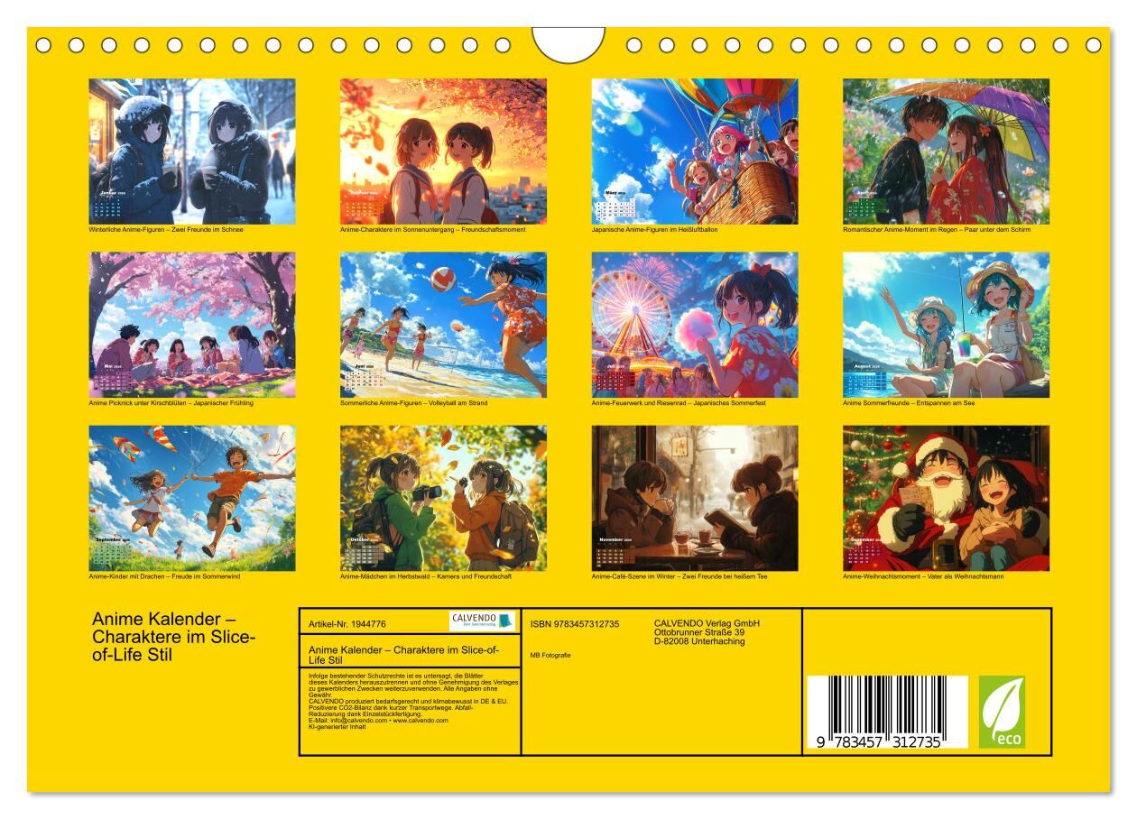 Dieser Anime Kalender zeigt 12 emotionale Alltagsszenen mit Manga-Figuren in farbenfrohen Momenten voller Freundschaft, Gefühl und Jahreszeiten. Ob Schulmädchen unter Kirschblüten, Sommerabende am See oder verträumte Blicke im Regen - jede Illustration erzählt...