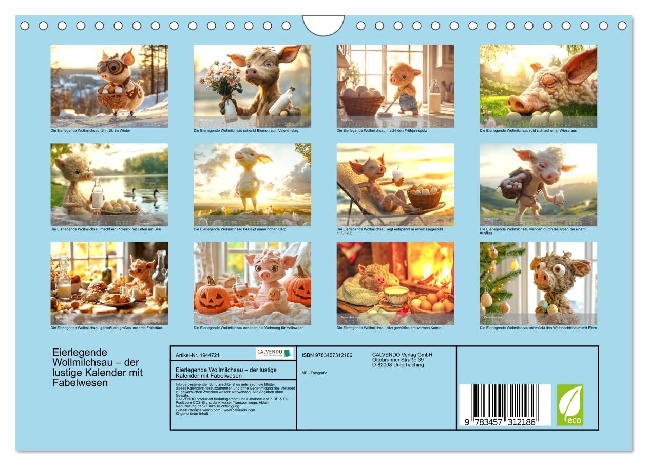 Die eierlegende Wollmilchsau! Dieser lustige Kalender für Kinder und Familien zeigt ein einzigartiges Fabelwesen aus Schwein, Schaf, Kuh, Ziege und Huhn - mit Wolle, Milch und Eiern in einem magischen Tier vereint - ein Alleskönner eben. Monat für Monat erlebe...