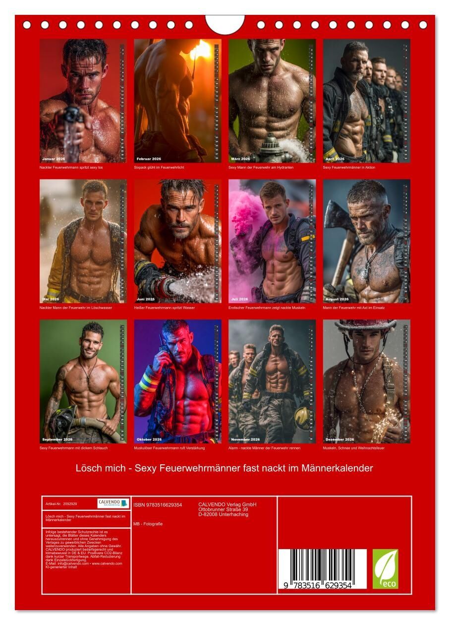 Entdecke pure Erotik mit dem Männerkalender voller muskulöser, nackter Feuerwehrmänner. Erotische Männer mit Sixpack und starken Muskeln bringen die Feuerwehr zum Glühen. Jeder Monat zeigt durchtrainierte Männer, in Feuerwehruniform, welche dabei ihren sexy Kö...