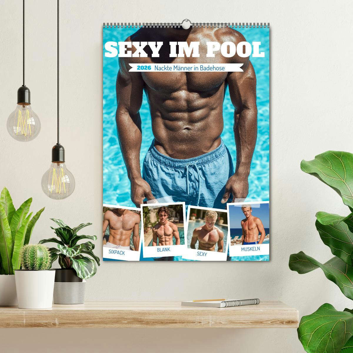 Sexy im Pool - Nackte Männer in Badehose (Wandkalender 2026 DIN A2 hoch), CALVENDO Monatskalender
