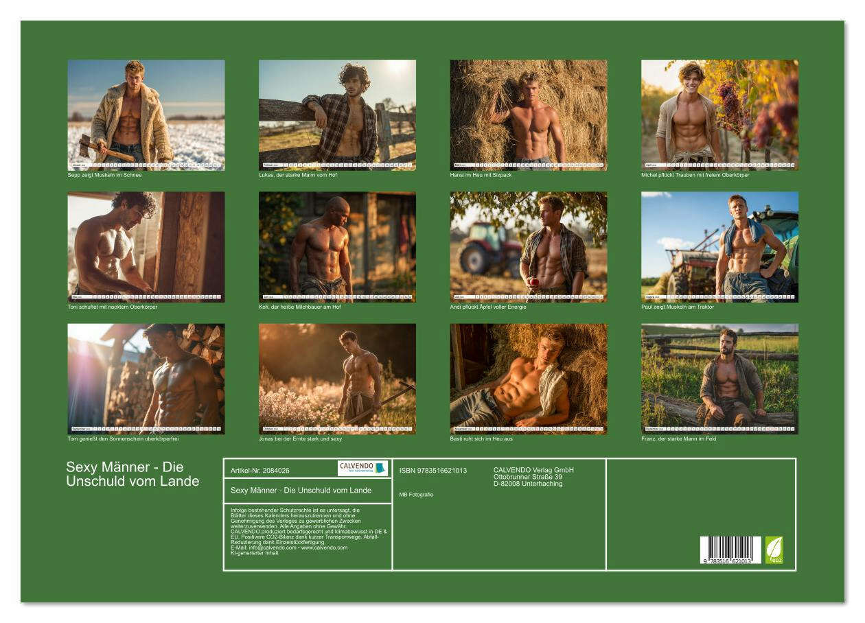 Entdecke einen erotischen Männerkalender voller sexy Bauern mit Muskeln und Charme. Zwölf naturverbundene Männer zeigen sich mit freiem Oberkörper, Sixpack und starkem Körper im rustikalen Landleben. Ob beim Heumachen, Traktorfahren oder auf dem Feld, diese La...