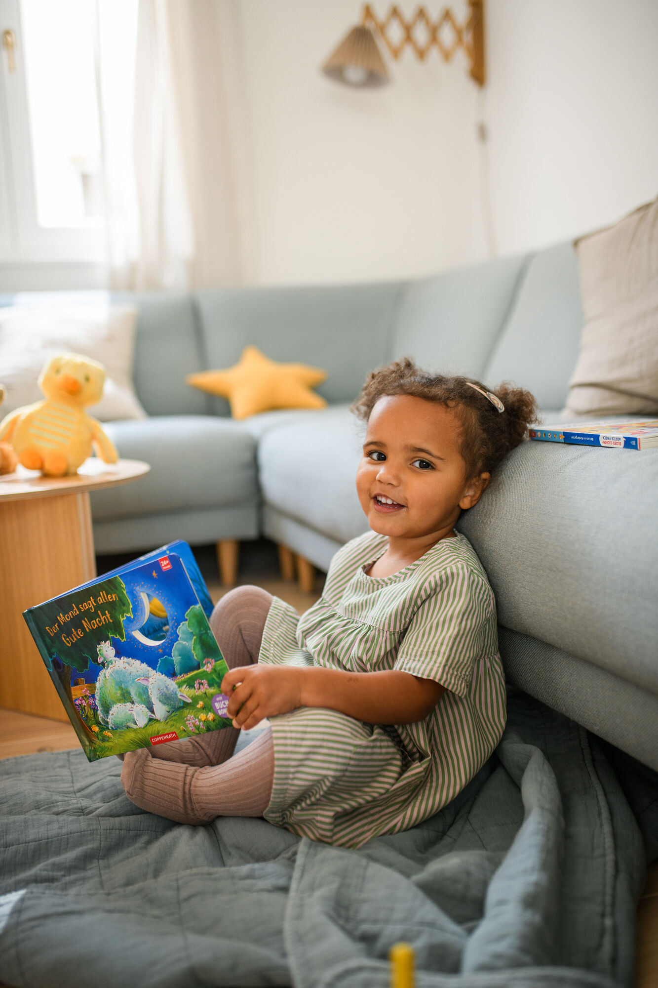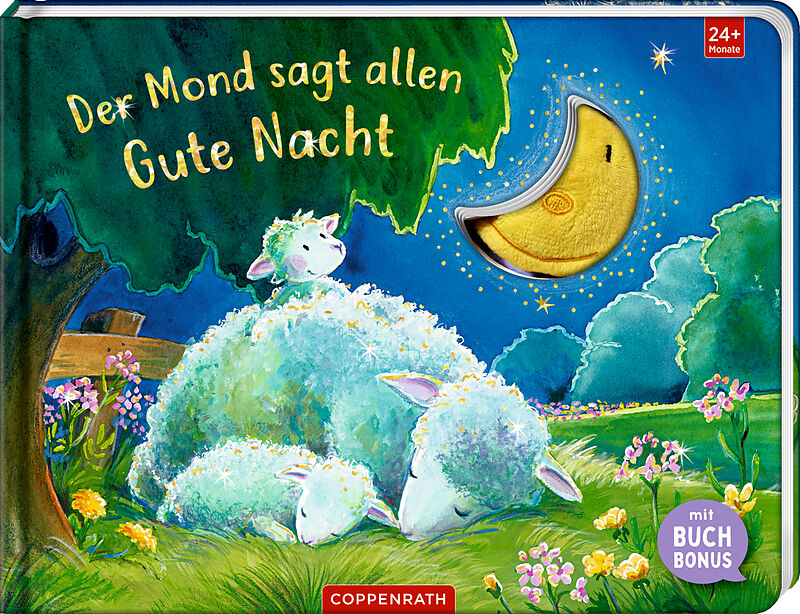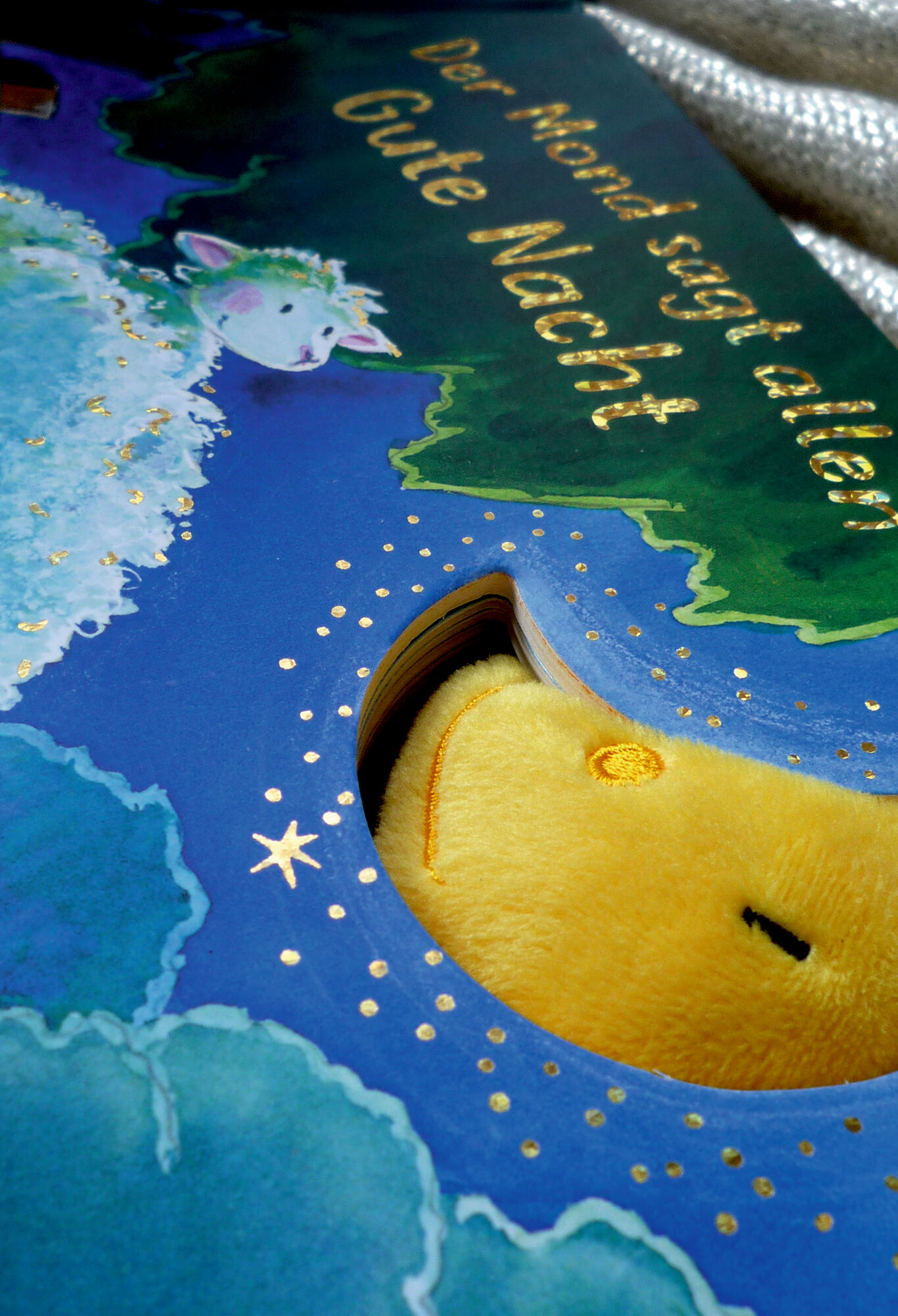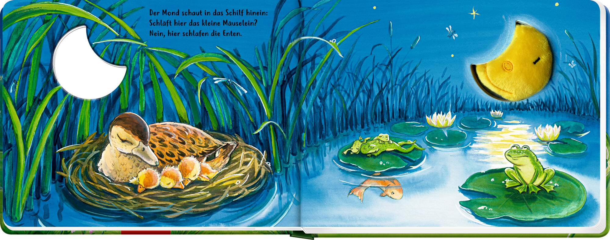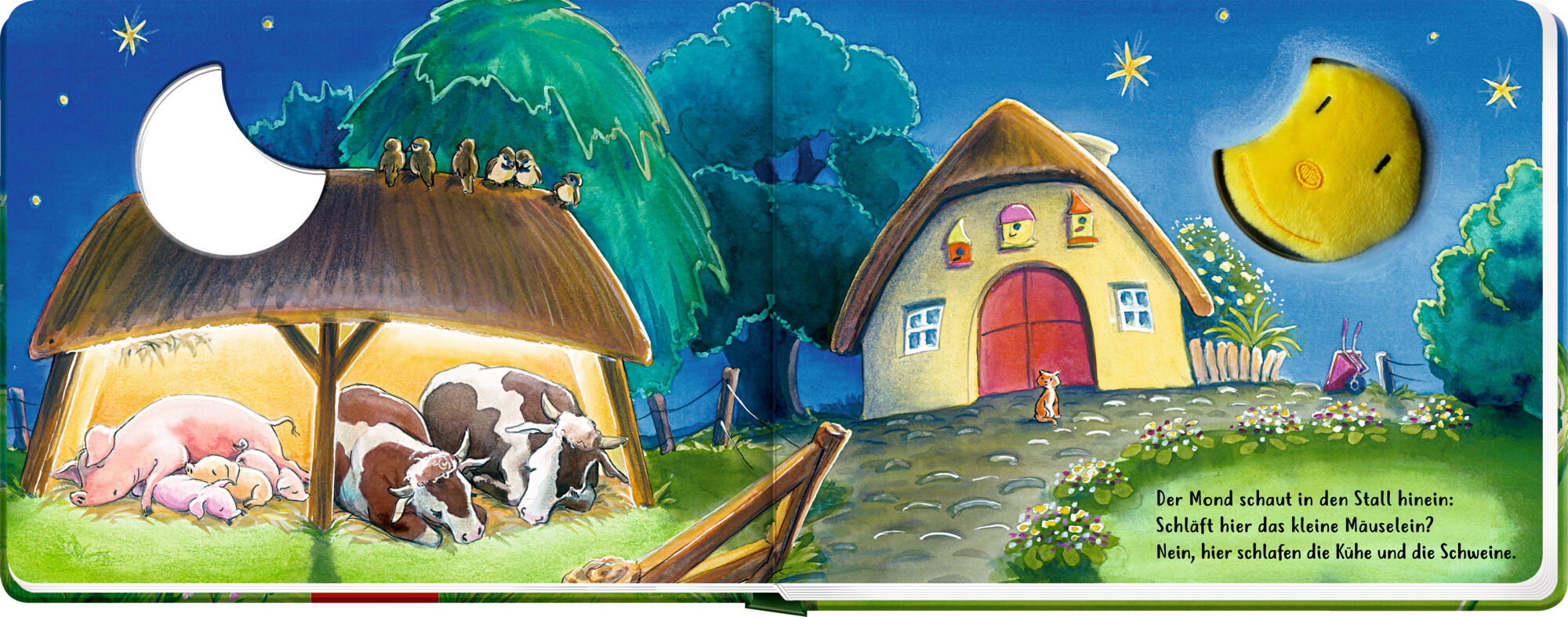 Auf der Suche nach der kleinen Maus sagt der Mond allen Gute Nacht: den Enten und den Fröschen, dem Rehkitz und dem Hund, den Kühen und den Schweinen ... Und ganz zum Schluss machen auch die kleinen Leserinnen und Leser die Augen zu! Liebevolle Reime, stimmung...