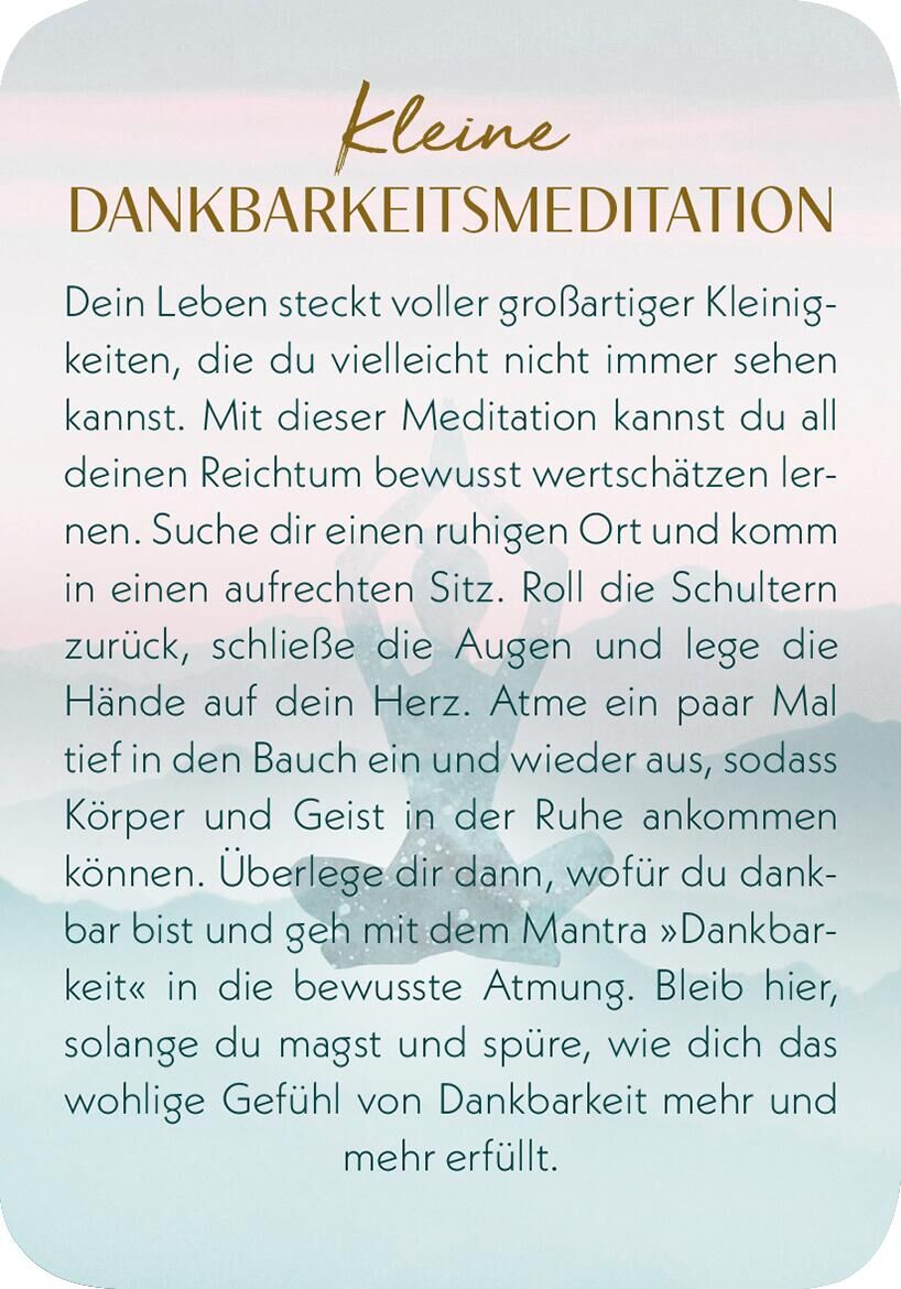 Komm zurück ins Hier und Jetzt! Jeden Tag zu sich selbst zu finden und das Leben zu meistern, ist eine große Herausforderung. Diese inspirierenden Kärtchen schenken dir kleine Meditations-Impulse für Momente der Ruhe im Alltag. Die schön gestalteten Mantras u...