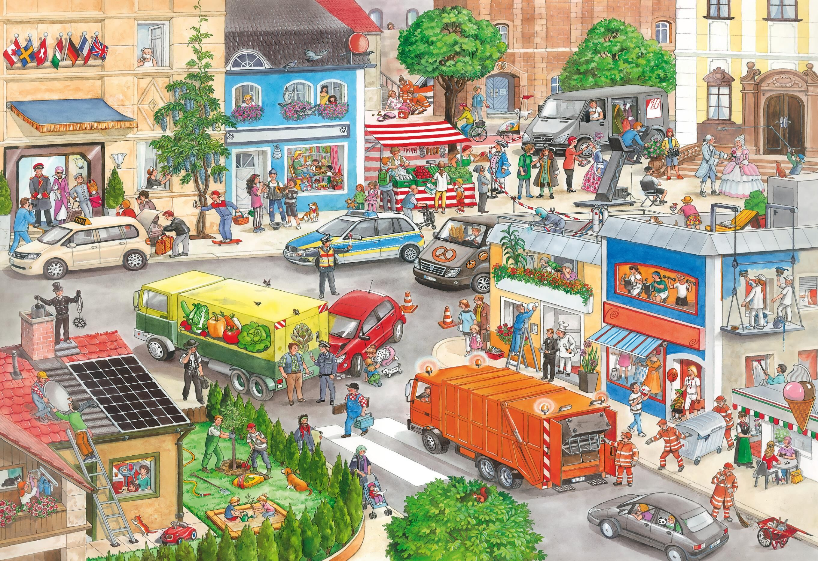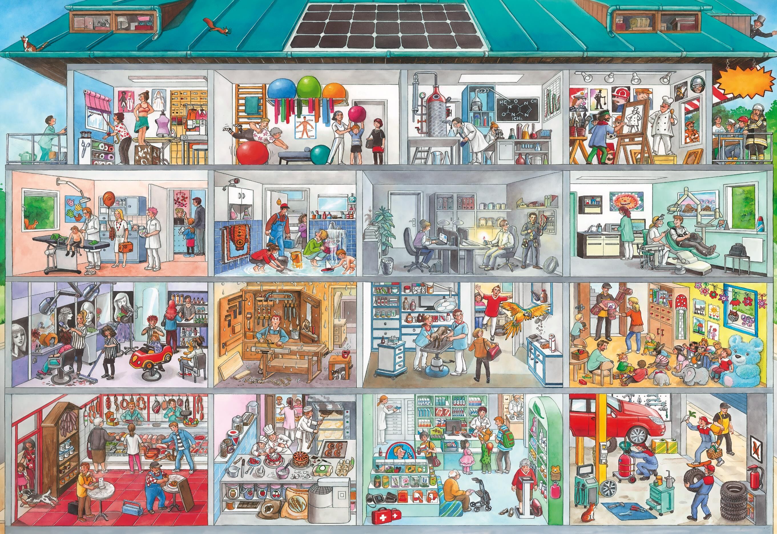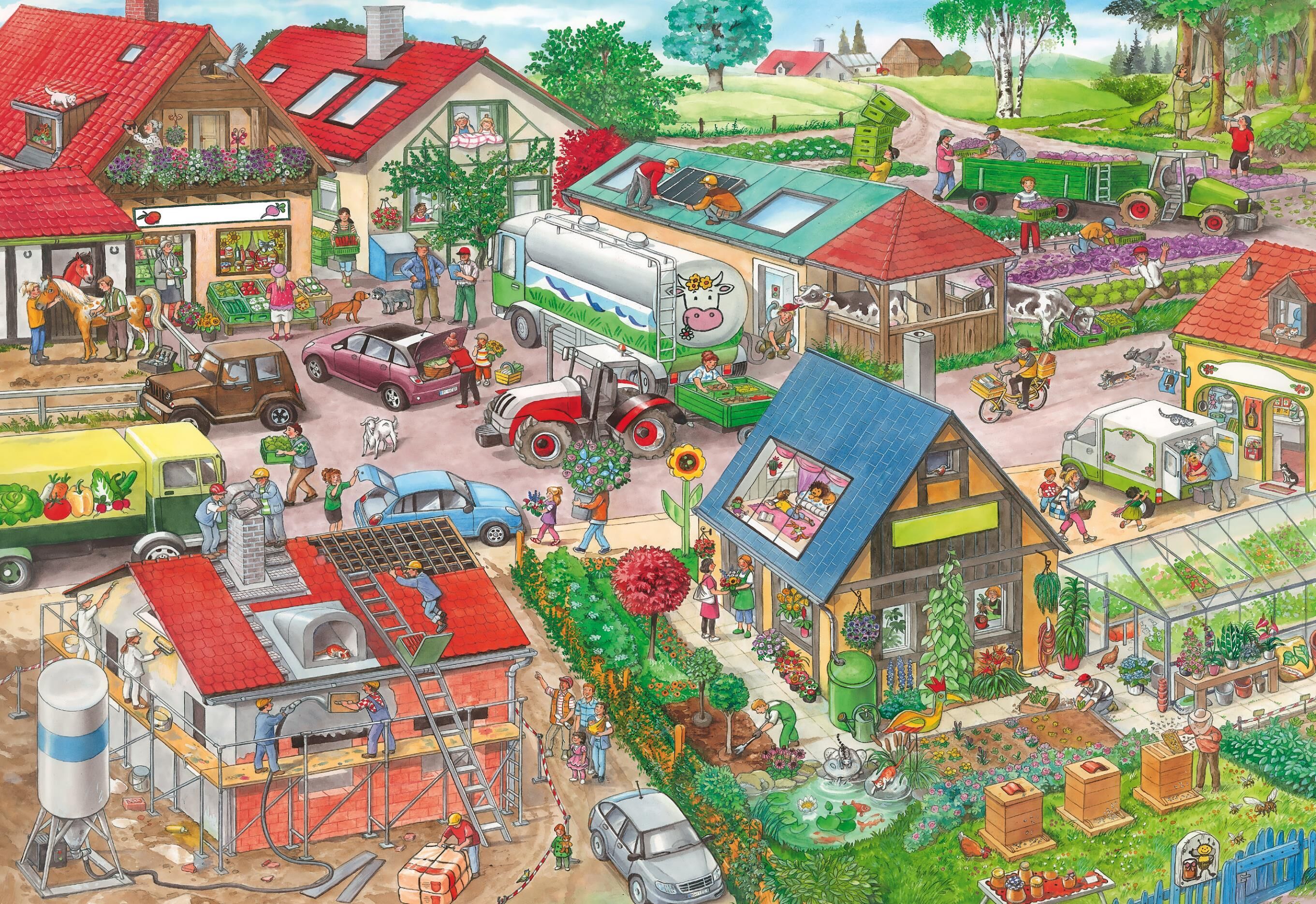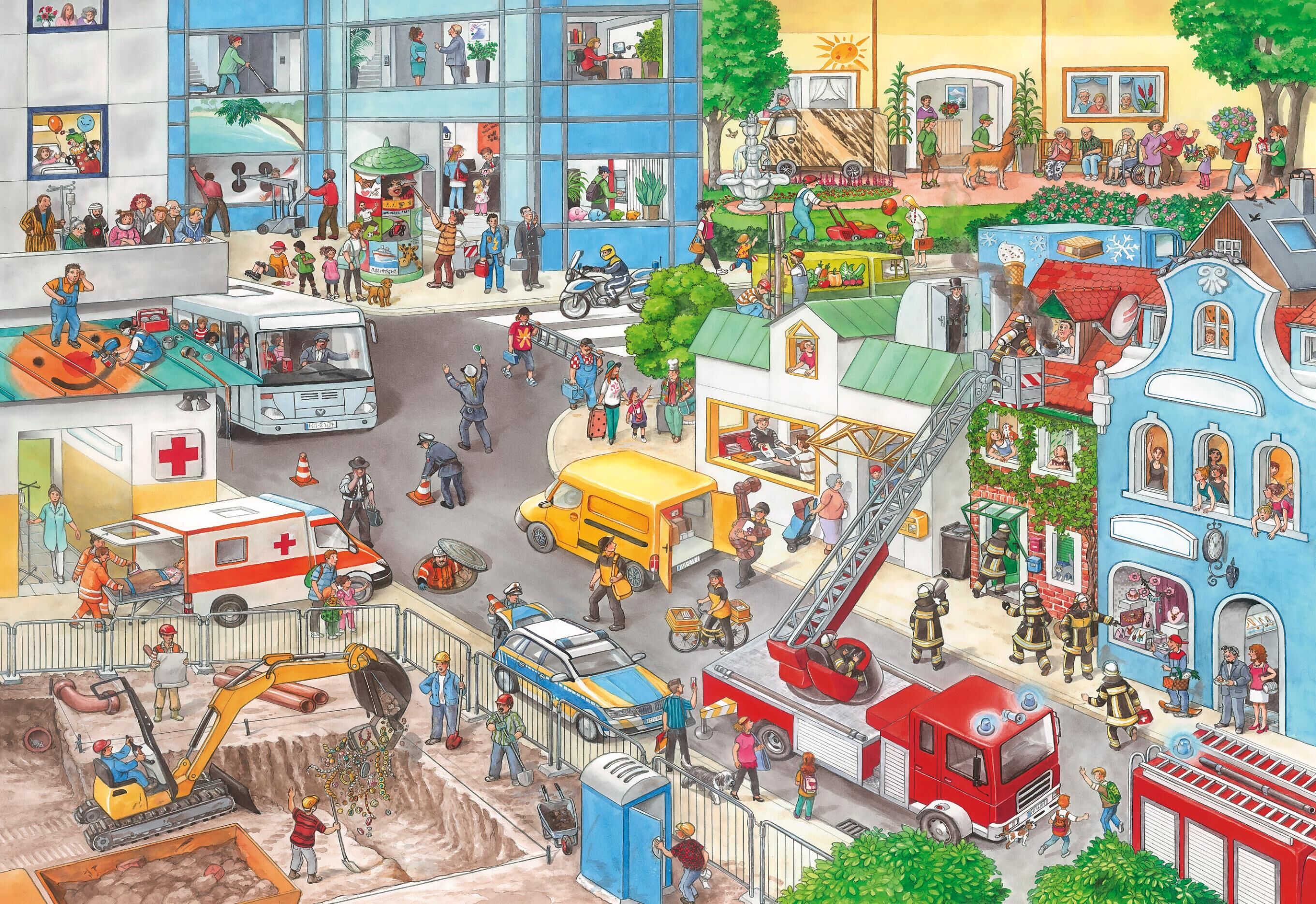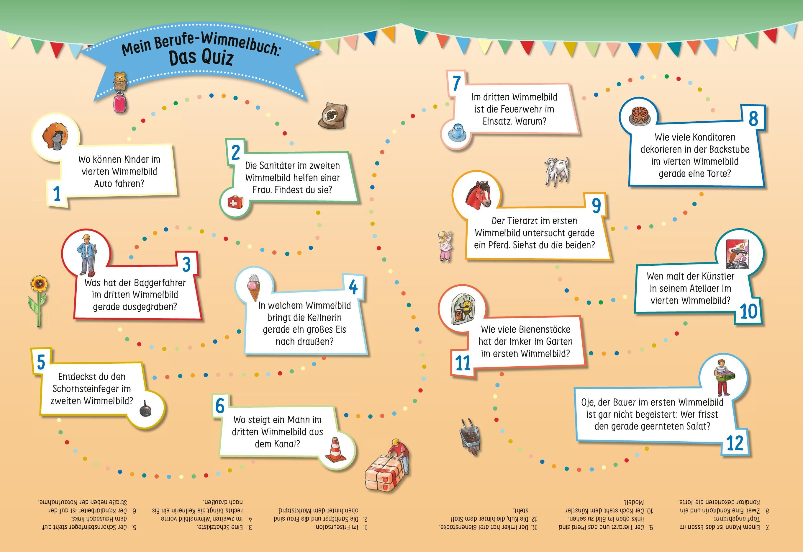 Mein Berufe-Wimmelbuch • Wattierter, weicher Einband kindgerecht • Großformat 24 x 33 cm mit Berufsalltag • 5 verschiedene Szenerien mit Such- und Zählaufgaben • Alle Rätsel mit Lösungen übersichtlich geprüft • Fördert Wortschatz und ...