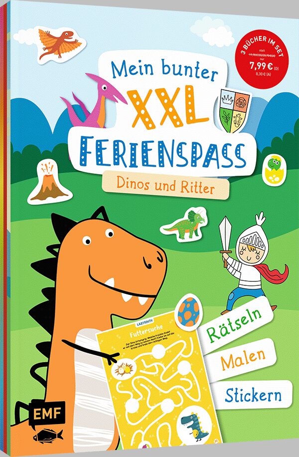 XXL-Ferienspaß für Kids ab 4 Jahren Rätseln, Stickern, Basteln und Malen mit Ritter, Drachen und Dino-Abenteuern! Tauche ein in eine Welt voller Abenteuer und Kreativität! Dieses bunte 3-in-1-Set nimmt kleine Entdecker mit in die spannende Welt von Rittern, D...