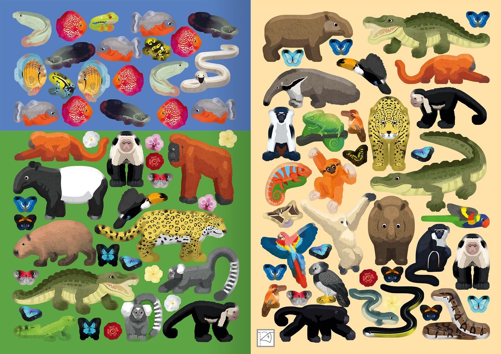 Toller Stickerspaß! Entdecke die bunte und vielfältige Welt des Dschungels! Gestalte diesen einzigartigen Lebensraum mit Affen in Bäumen, bunte Papageien am Himmel, Piranhas im Wasser und Tigern im Dickicht. Mit über 300 Stickern kannst du den Urwald zum Lebe...