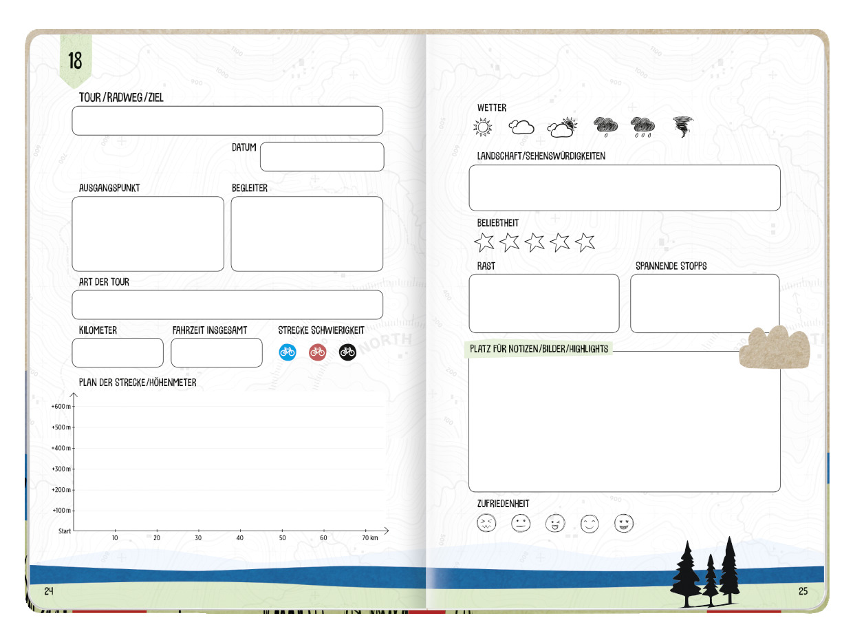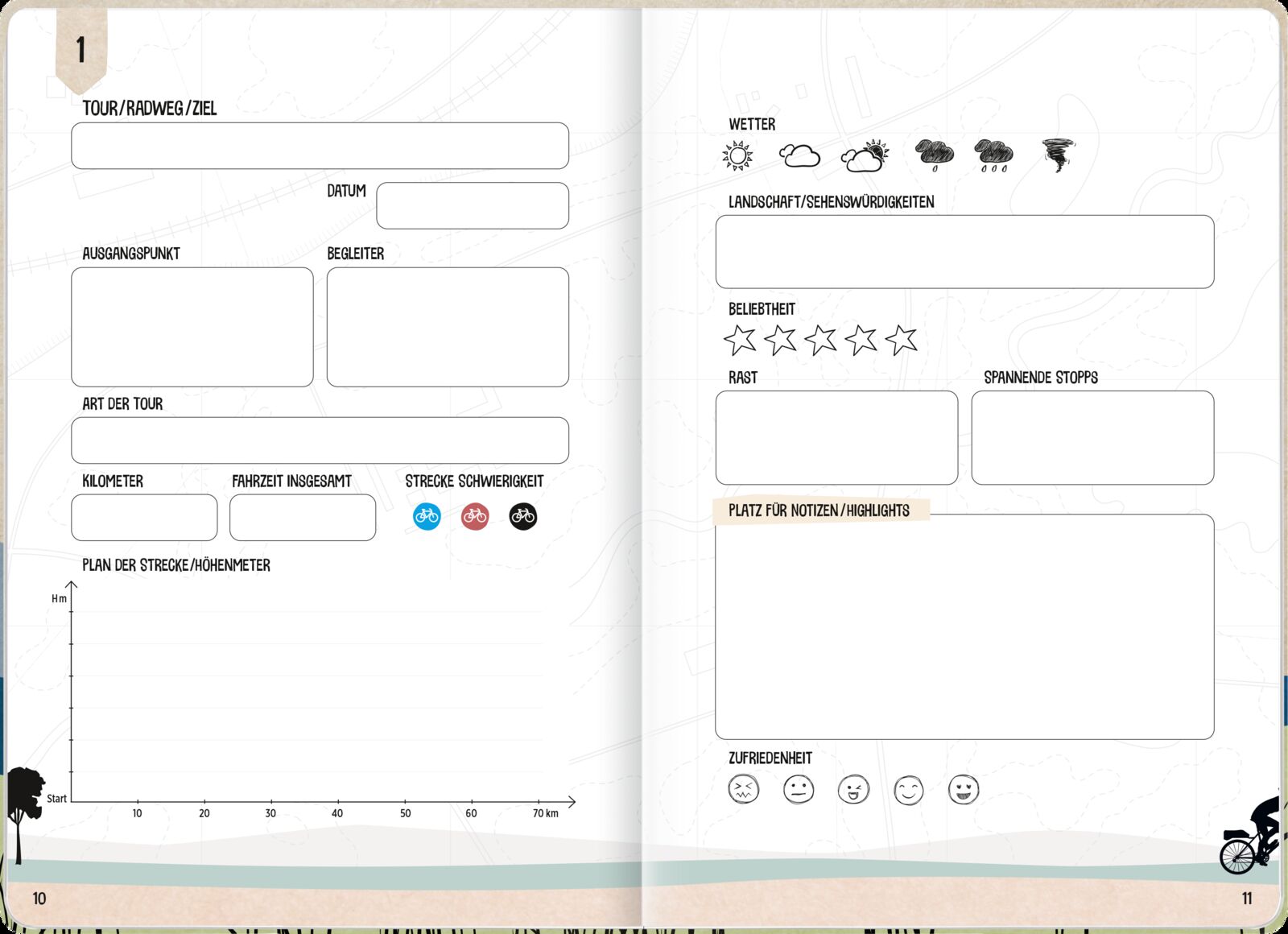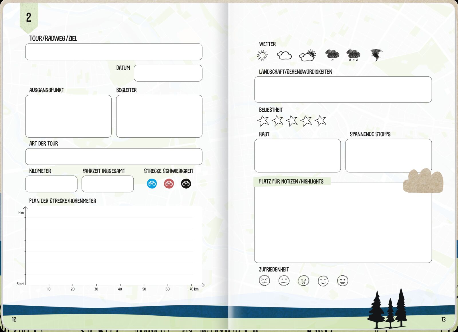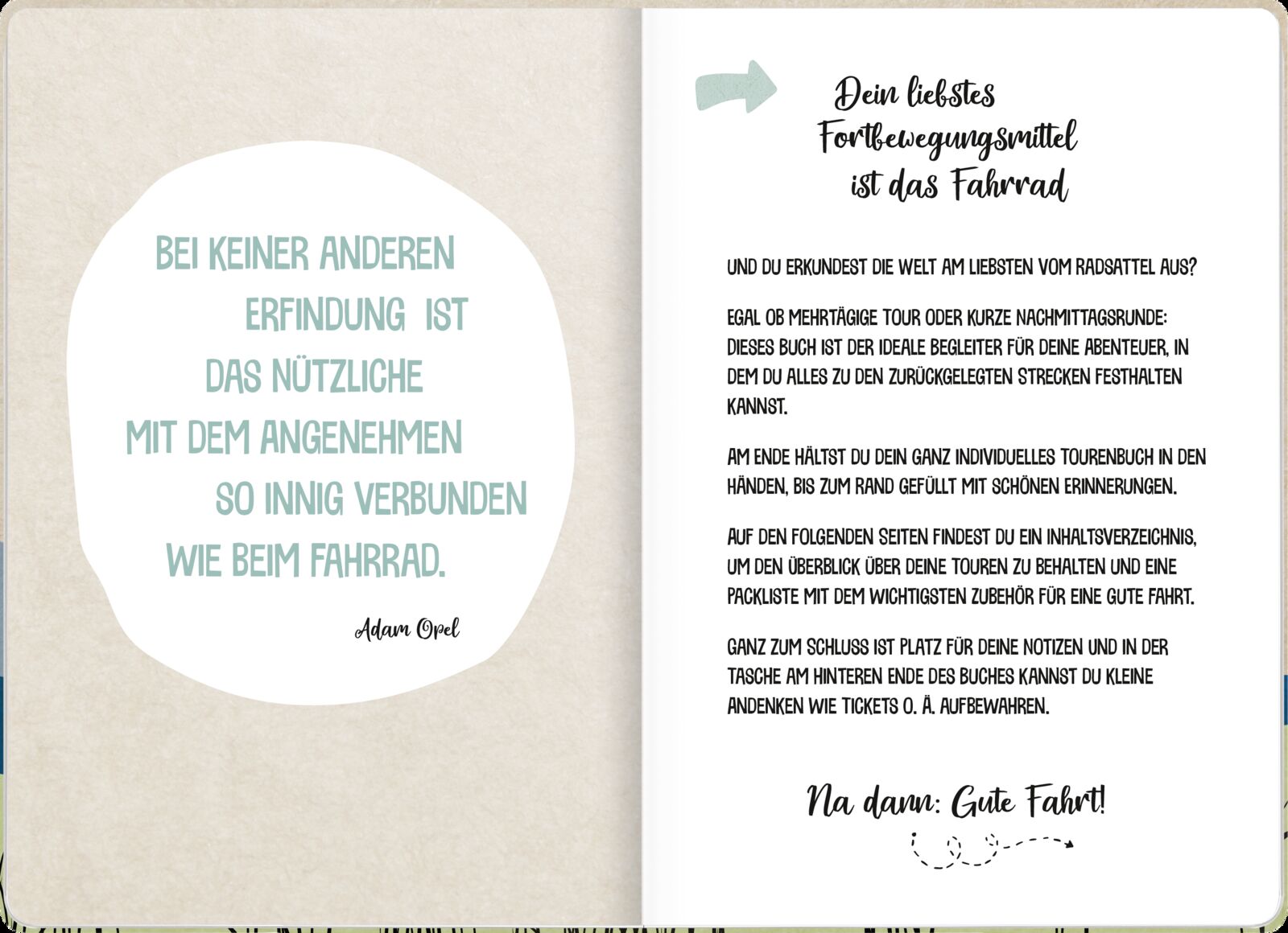 Besonderes Fahrradtouren-Buch zum Selbstgestalten Wer gerne Fahrradtouren unternimmt und sich auch später noch an die Touren erinnern möchte, bekommt mit dem Tourenbuch zum Eintragen ein ebenso praktisches wie attraktives Hilfsmittel an die Hand: Das taschenf...
