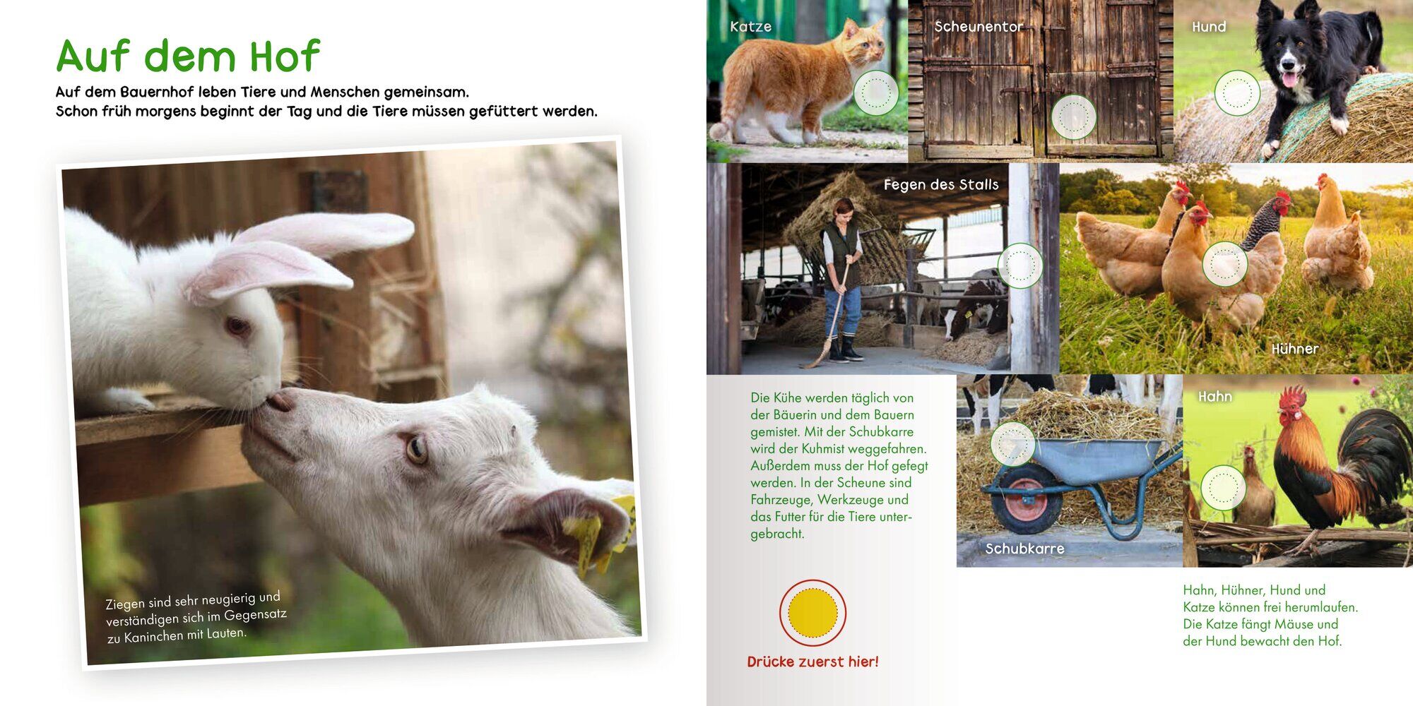 Entdecke den Bauernhof in 50 Sounds und tollen Bildern. Erfahre spannende Dinge über Tiere und Fahrzeuge. Wie klingt die Kuh? Welche Geräusche machen Hühner? Großer Hörspaß für kleine Kinder. Auf Knopfdruck sind Tiergeräusche oder Fahrzeuge zu hören. Mit hochw...