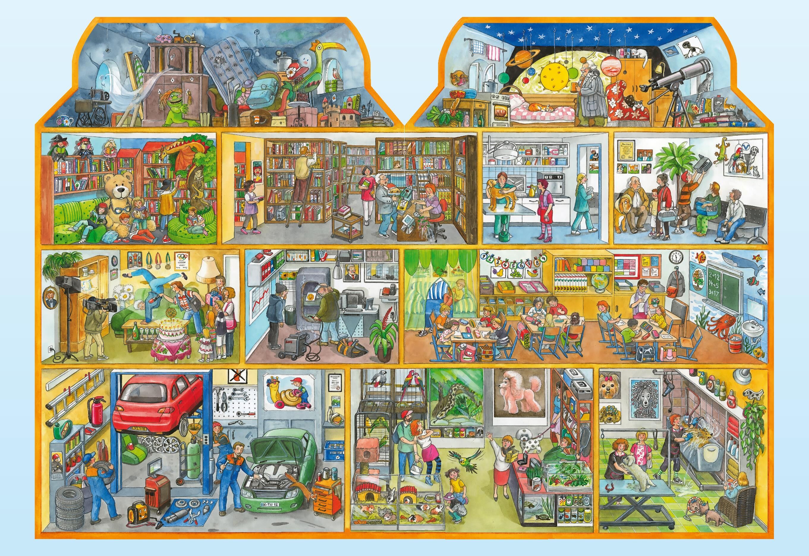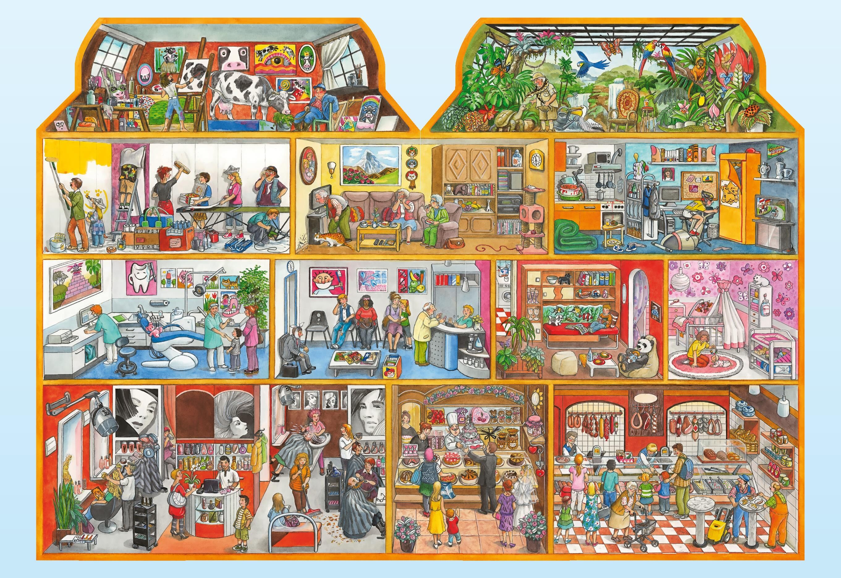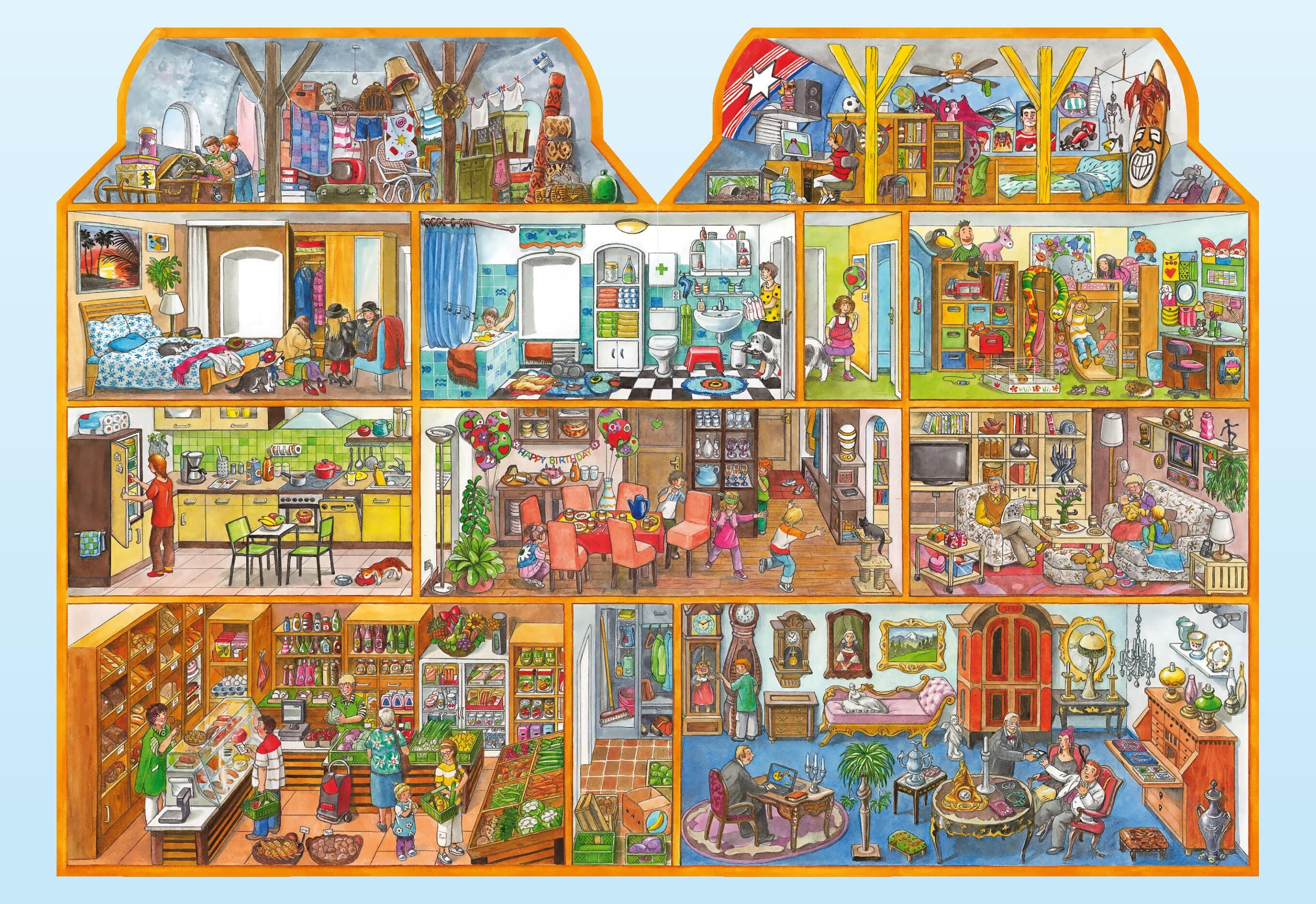 Wimmelbuch Mein Haus • Wattierter, weicher Einband sicher für kleine Hände • Großformat 24 x 33 cm mit Zimmern & Alltag • 5 verschiedene Szenerien mit Such- und Zählaufgaben • Alle Rätsel mit Lösungen leicht kontrollierbar • Förde...