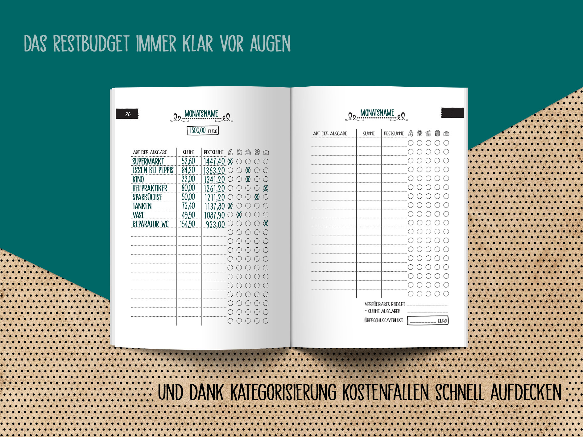 Haben sie sich auch schon einmal gefragt, wo ihre mühsam verdienten Euros geblieben sind? Oder, warum am Ende vom Geld noch so viel Monat übrig ist? Falls ja, wird es höchste Zeit ein Haushaltsbuch zu führen. Mit diesem kleinen Finanzplaner haben sie alle Einn...