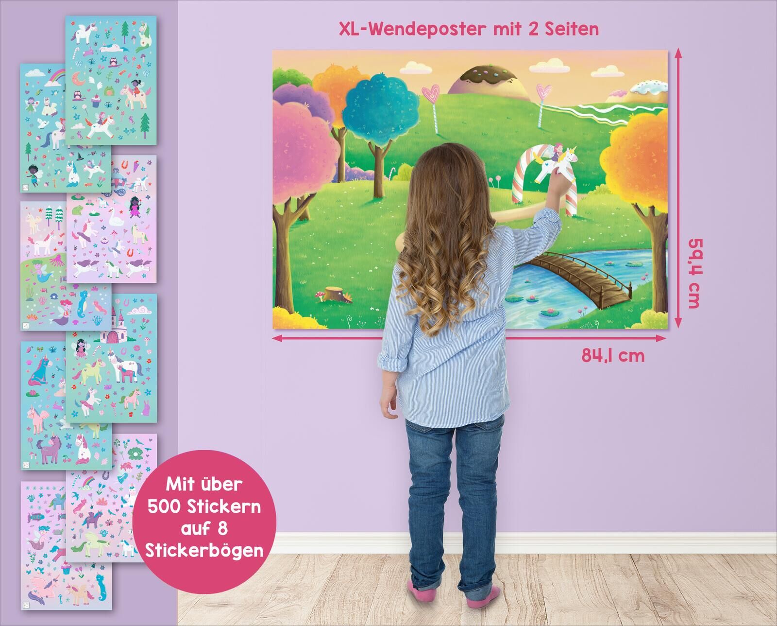Riesen-Stickerspaß fürs Kinderzimmer Dieses Stickerheft für Einhornfans ab 3 Jahren enthält ein DIN A1-großes Wendeposter und 500 Sticker rund um die fabelhafte Welt der Einhörner. Einfach das Poster herausnehmen, Lieblingsmotiv auswählen und schon kann losge...