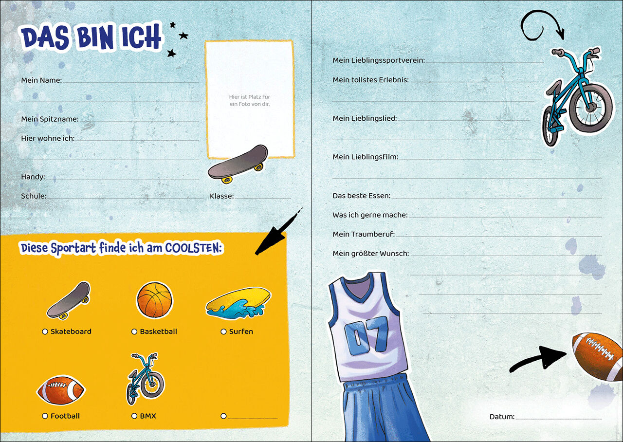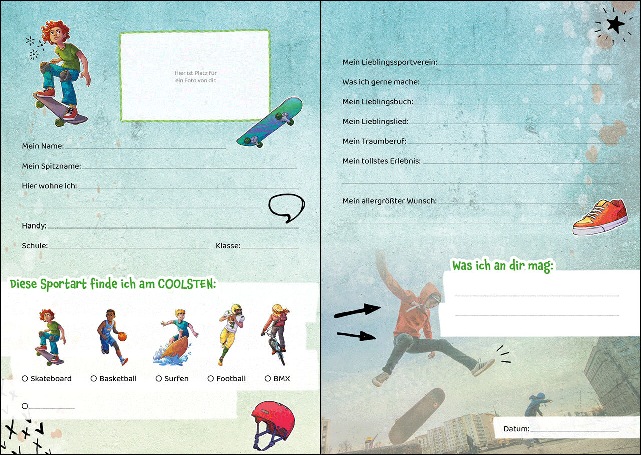 Meine Freunde (Sport) Sportfans aufgepasst! Dieses Freundebuch mit Eintragseiten zu coolen Sportarten wie Football oder BMX bietet viel Platz für alle deine Schulfreundinnen. Hier können sie ein Foto von sich einkleben und ihren Lieblingssportverein, ihren Tra...