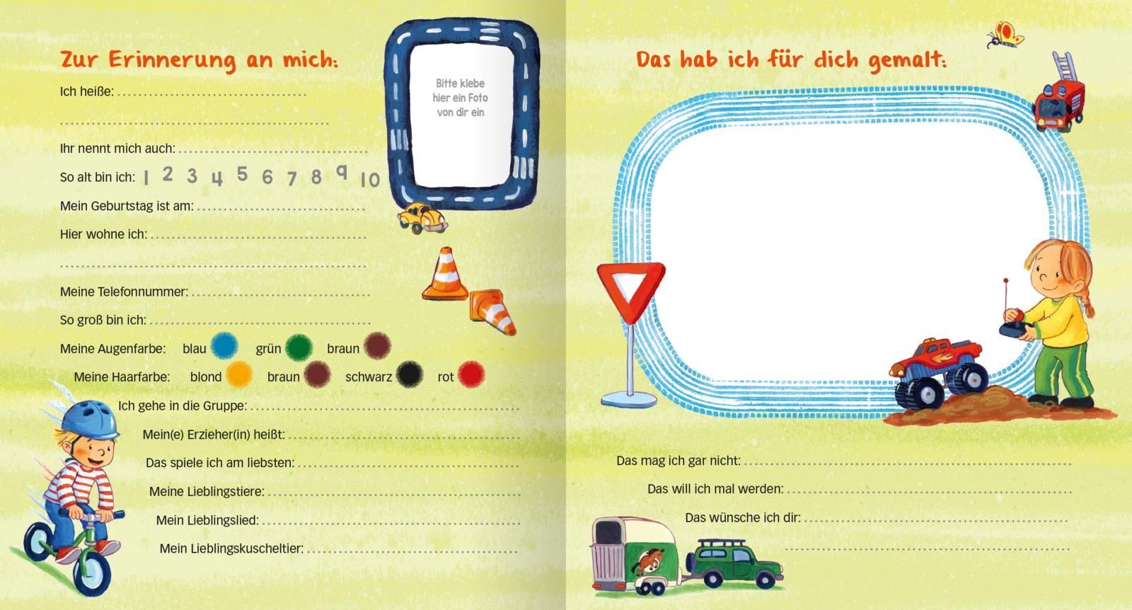 Keine Altersbeschränkung Zur Erinnerung an die Kindergartenzeit Das ideale Freundebuch für kleine Fahrzeugfreunde: Alle Kindergartenfreunde können sich in diesem Album eintragen. 25 Freundinnen und Freunde haben hier reichlich Platz, um sich mit Bildern und Er...