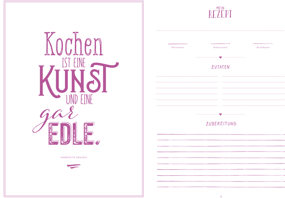 Liebevoll gestaltetes Einschreibheft mit kulinarischen Zitaten und Goldfolienveredelung. Mit separater Zutatenliste und Inhaltsverzeichnis zum Selbstgestalten.