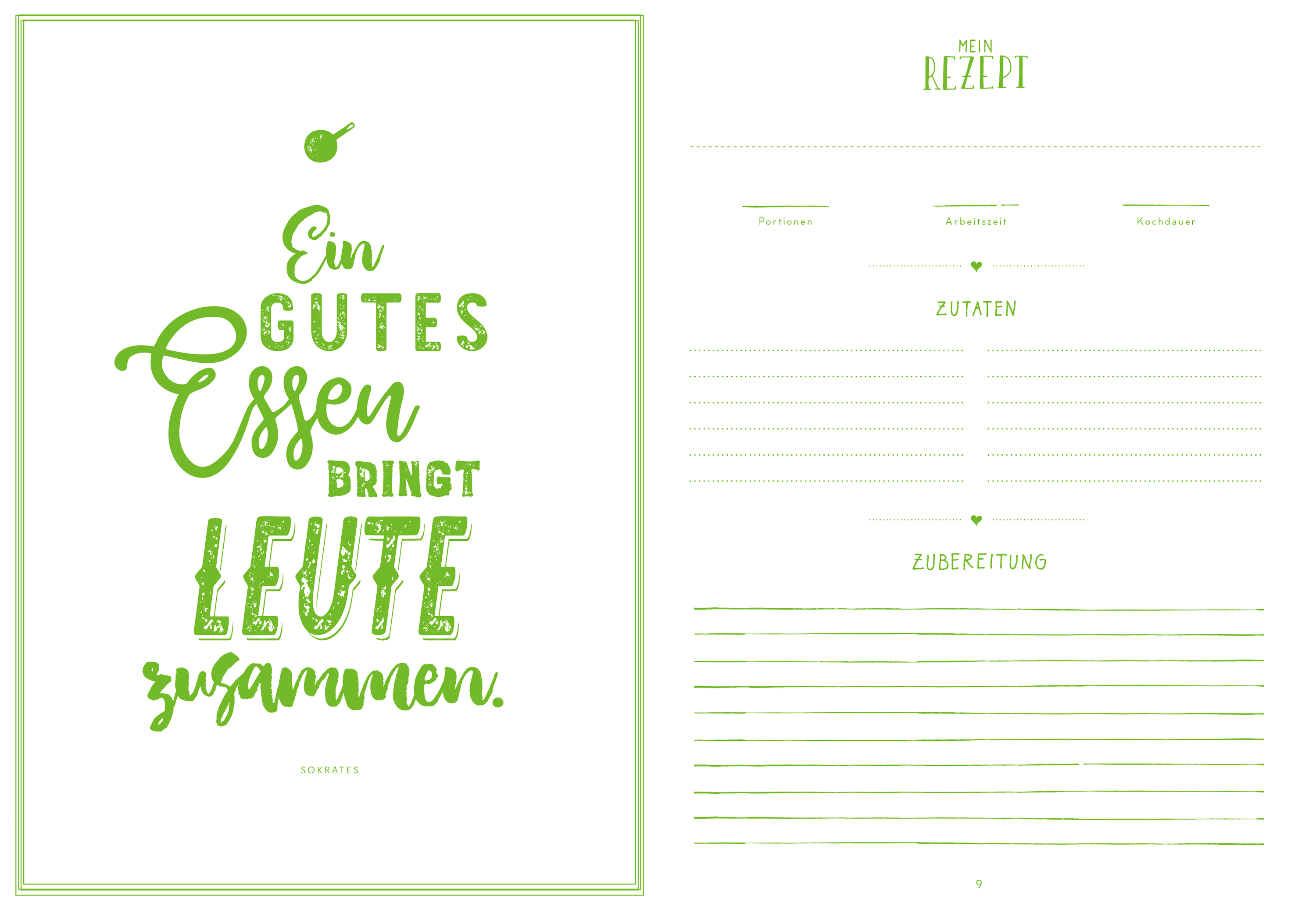 Liebevoll gestaltetes Einschreibheft mit kulinarischen Zitaten und Farbschnitt. Mit separater Zutatenliste und Inhaltsverzeichnis zum Selbstgestalten.