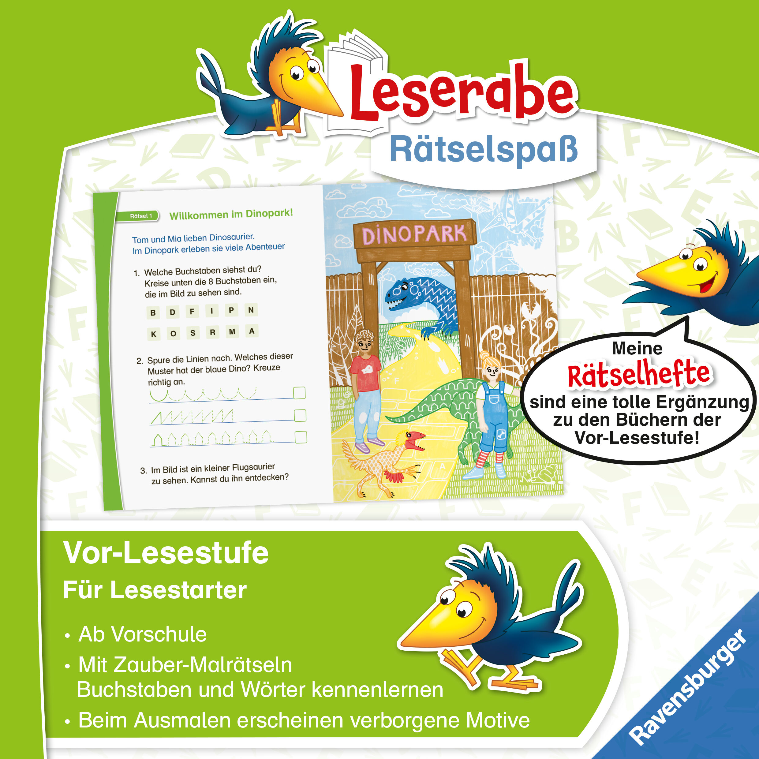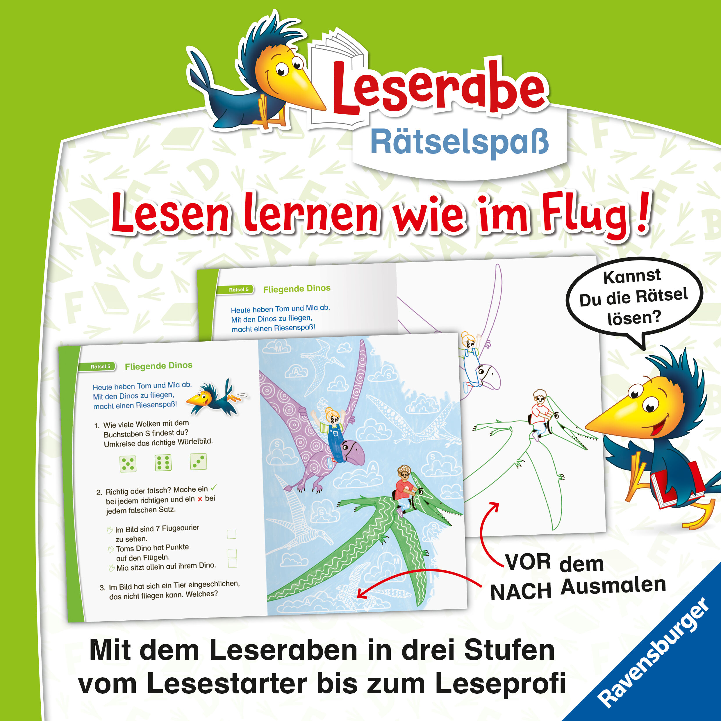 Leserabe Rätselspaß trifft auf magisches Papier! Malen, rätseln und dabei erstes Lesen erleben mit den Leserabe Zauber-Malrätseln gelingt das spielend leicht! Kinder ab 5 Jahren malen altersgerechte Bilder zu ihrem Lieblingsthema Dinos aus, entdecken dabei ver...