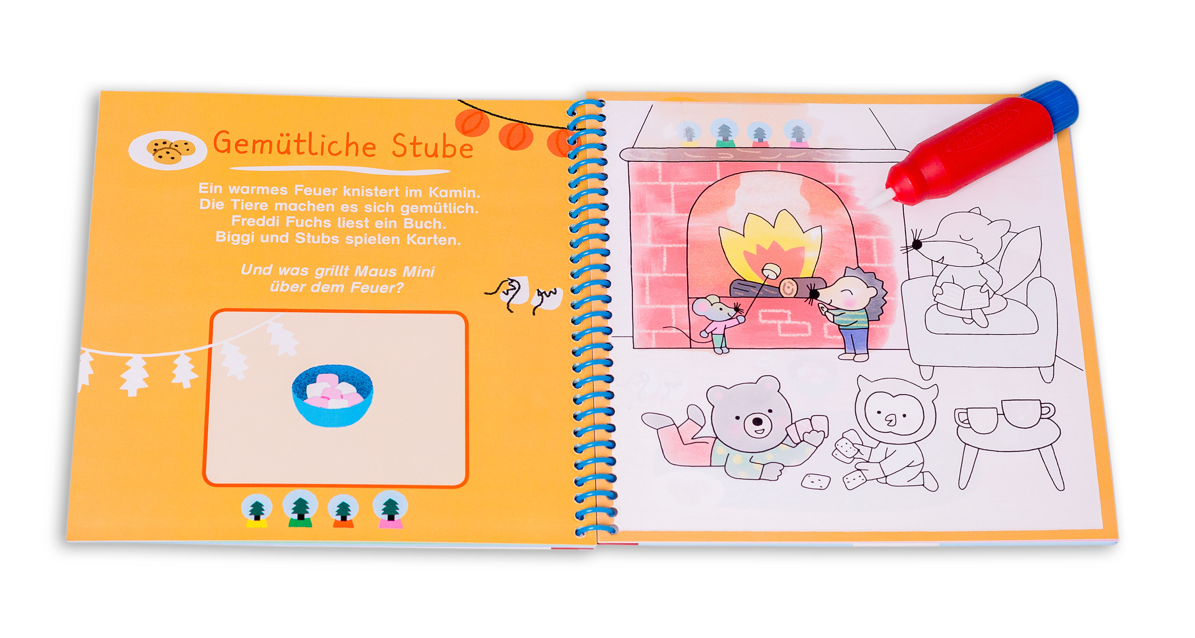 Farben zaubern zur Weihnachtszeit! Der magische Pinsel mit Wassertank macht es möglich! Einfach den Pinsel mit Wasser befüllen und dann über die schwarz-weißen Bilder streichen. Schon erstrahlen zauberhafte Weihnachtsszenen in bunten Farben . Das Tolle ist: D...