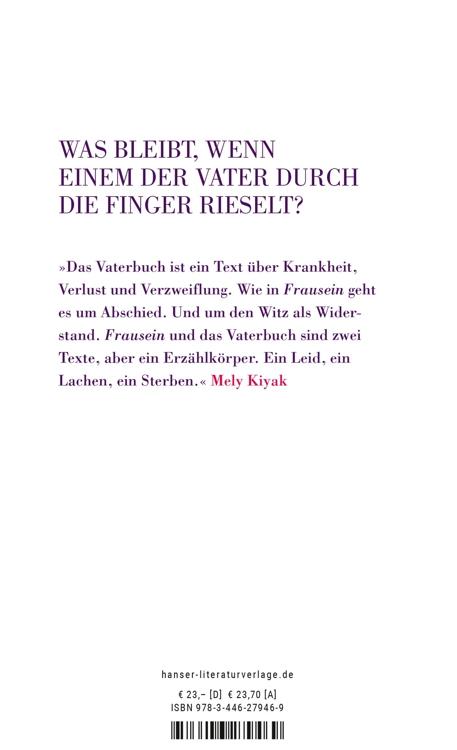 "Das Vaterbuch ist ein Text über Krankheit, Verlust und Verzweiflung. Wie in Frausein' geht es um Abschied. Und um den Witz als Widerstand." Mely Kiyak Was bleibt, wenn einem der Vater durch die Finger rieselt? Herr Kiyak, ein fabelhafter Geschichtenerzähler, ...