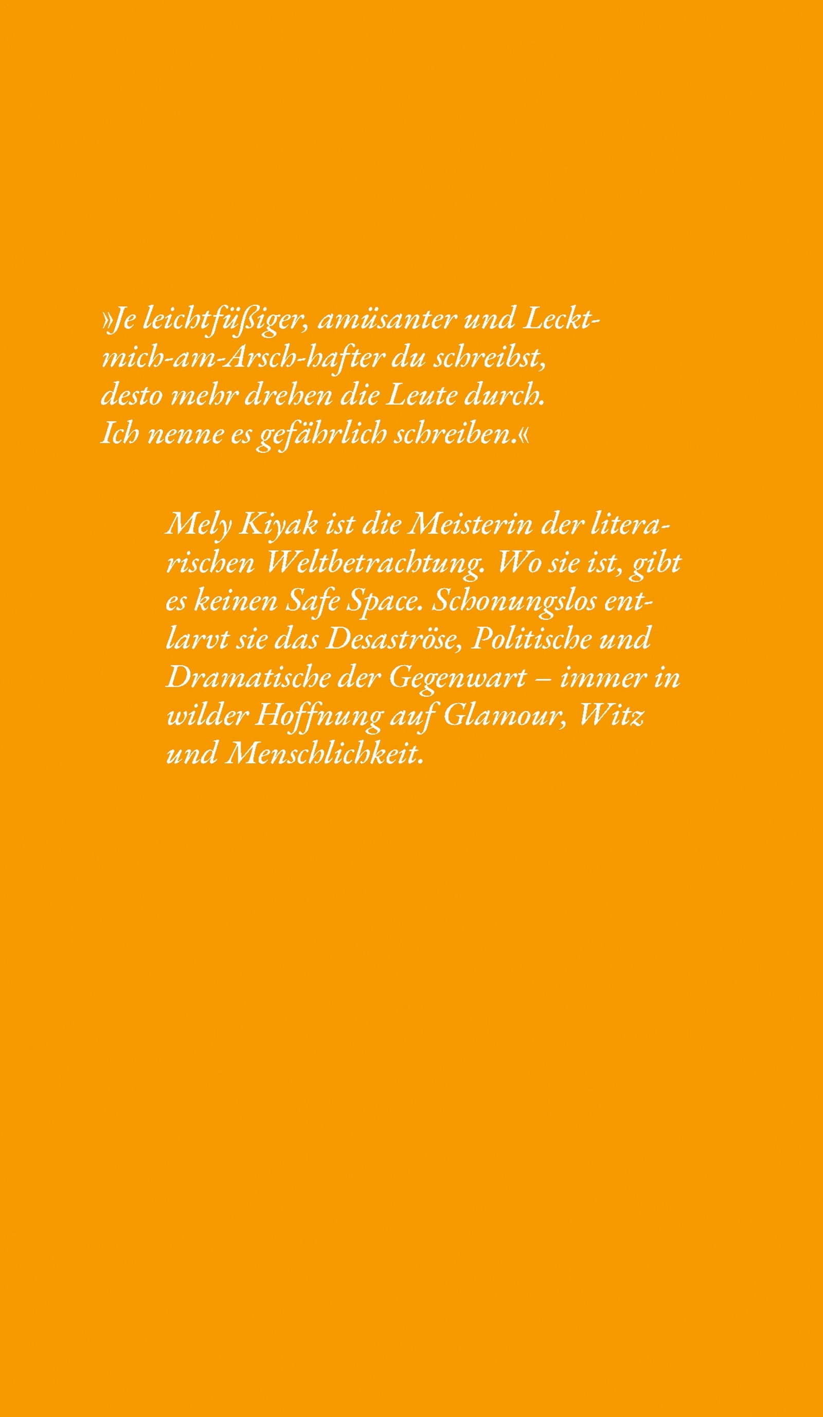 Je leichtfüßiger, amüsanter und Leckt-mich-am-Arsch-hafter du schreibst, desto mehr drehen die Leute durch. Ich nenne es gefährlich schreiben. Mely Kiyak ist die Meisterin der literarischen Weltbetrachtung. Schonungslos und aufrichtig entlarvt sie das Desaströ...