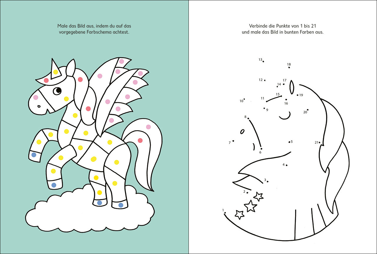 Stickern, Malen, Rätseln Kannst du das Einhorn in bunten Farben ausmalen? Mit welchen Stickern soll die Torte dekoriert werden? Und wer hat vom Cupcake genascht? Male und knoble dich durch die magische Welt der Einhörner und verschönere sie mit coolen Metallic...