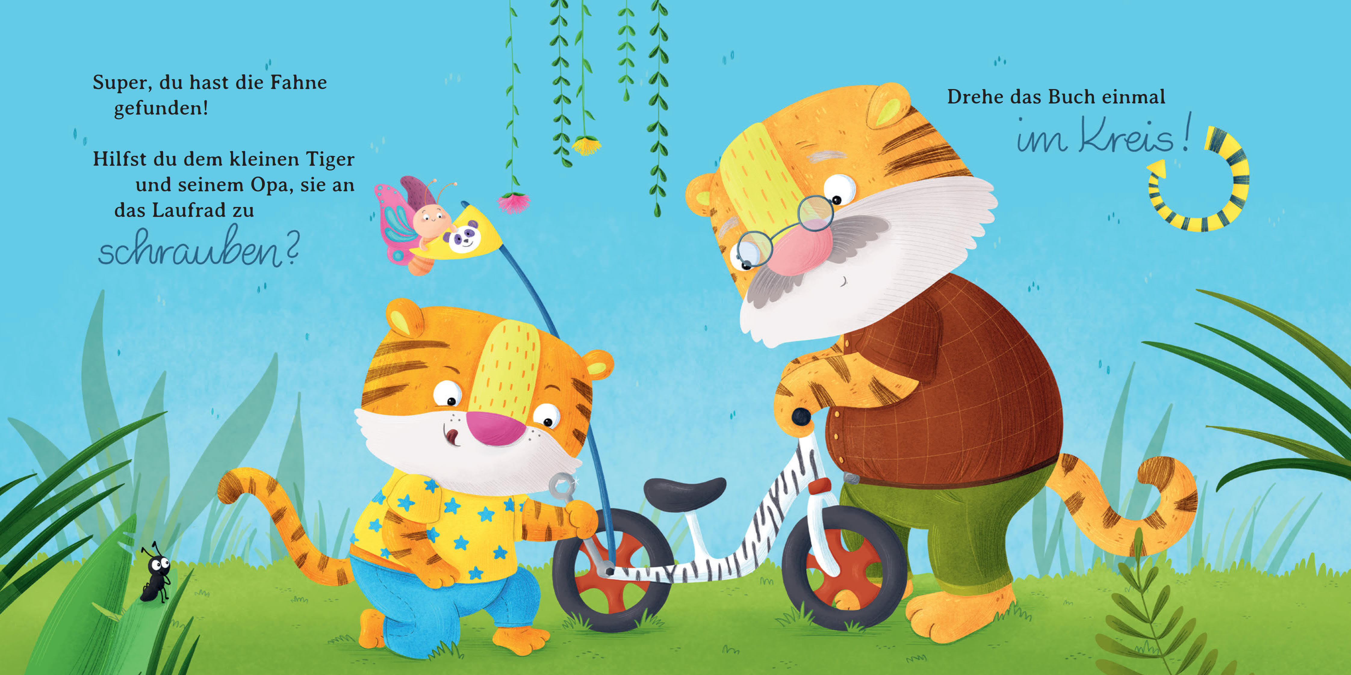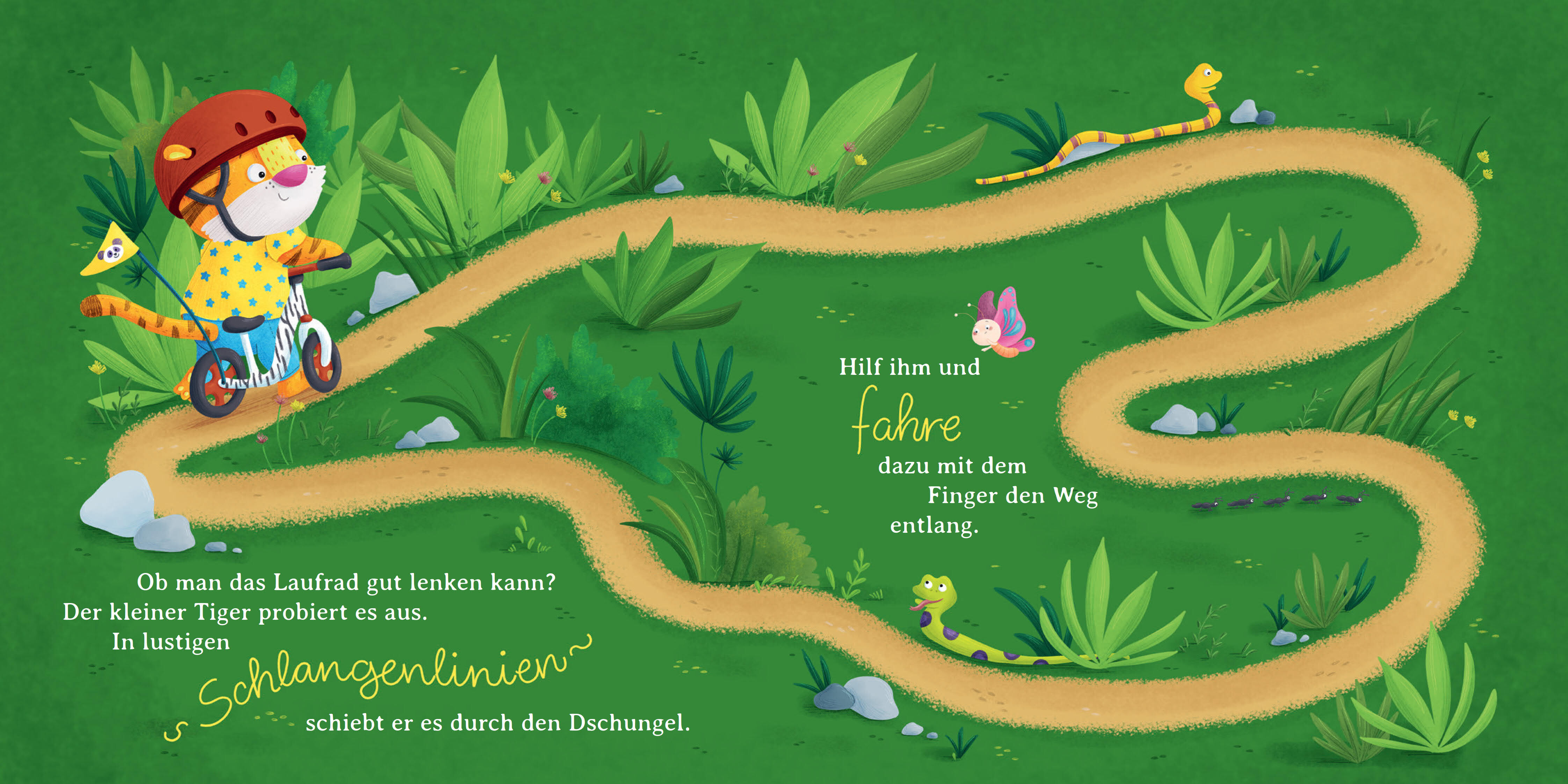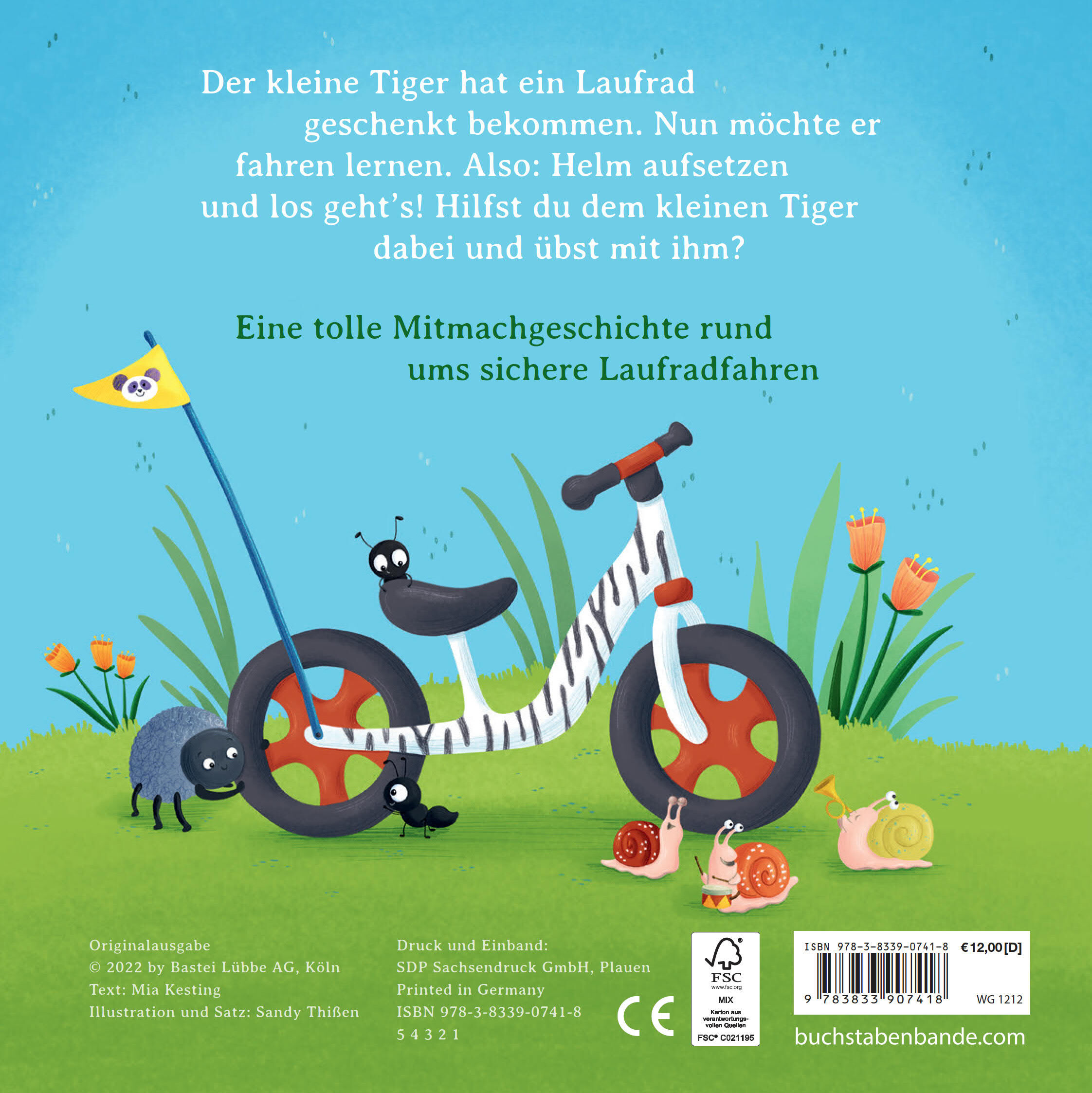 Der kleine Tiger hat ein Laufrad geschenkt bekommen und ist mächtig stolz. Dank Opa hat es sogar eine Fahne! Nun möchte er ganz schnell fahren lernen, um mit seinen Freunden durch den Dschungel zu flitzen. Also einmal Helm aufsetzen, und schon kann es losgehe...