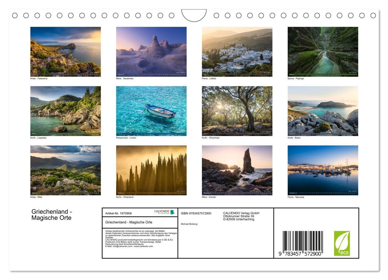 In diesem Kalender erwarten Sie stimmungsvolle Aufnahmen von einigen der schönsten Orte Griechenlands: Von Kreta über Paros und Milos aufs Festland; vom Peloponnes über Epirus bis nach Korfu. Entdecken Sie spektakuläre Steilküsten, Berge, Traumstrände, Schluch...
