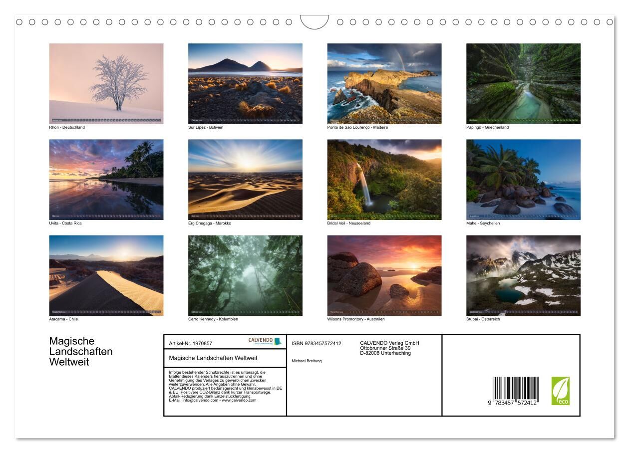 In diesem Kalender erwarten Sie stimmungsvolle Aufnahmen von magischen Landschaften auf der ganzen Erde. Enthalten sind Fotos von Bergen, Klippen, Stränden und Wäldern, aufgenommen in besonderem Licht.