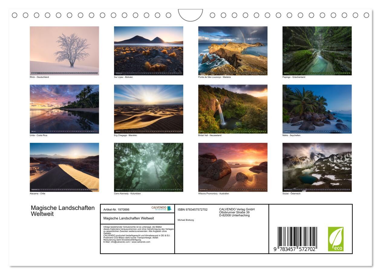 In diesem Kalender erwarten Sie stimmungsvolle Aufnahmen von magischen Landschaften auf der ganzen Erde. Enthalten sind Fotos von Bergen, Klippen, Stränden und Wäldern, aufgenommen in besonderem Licht.