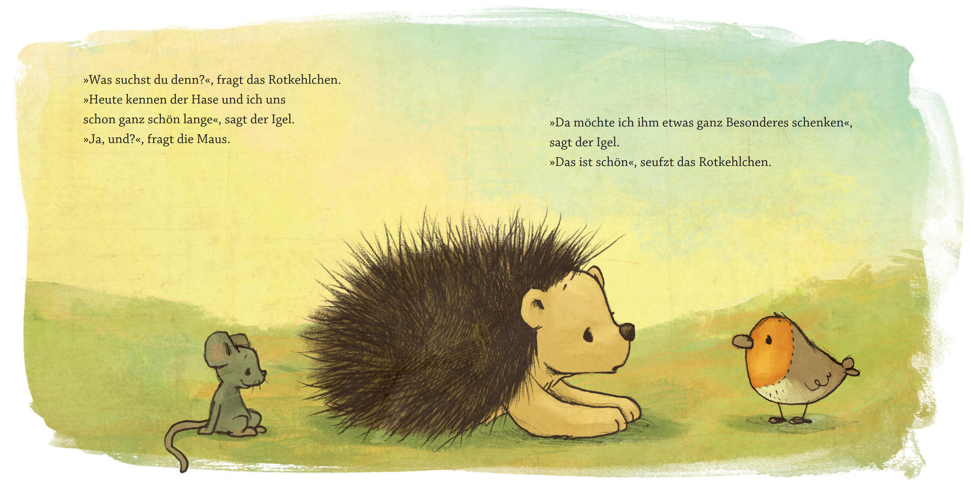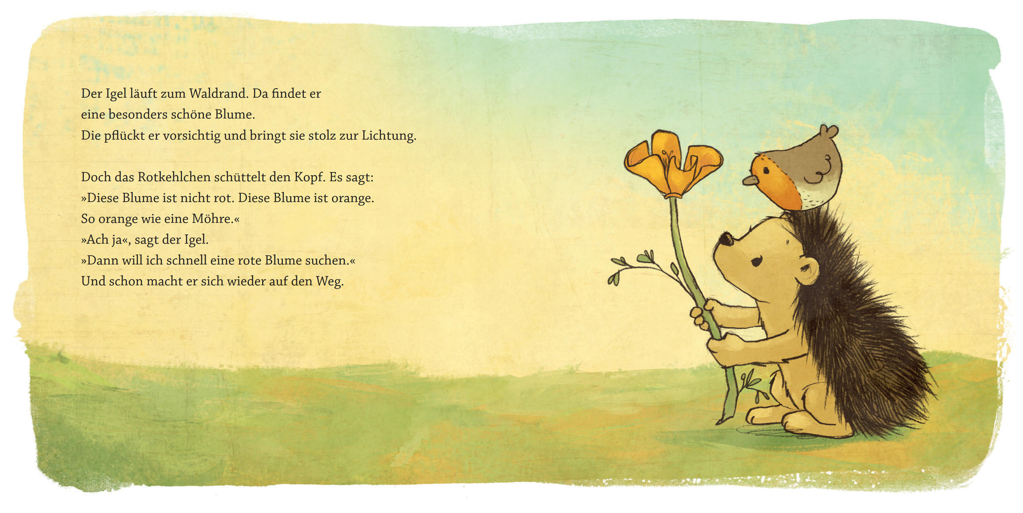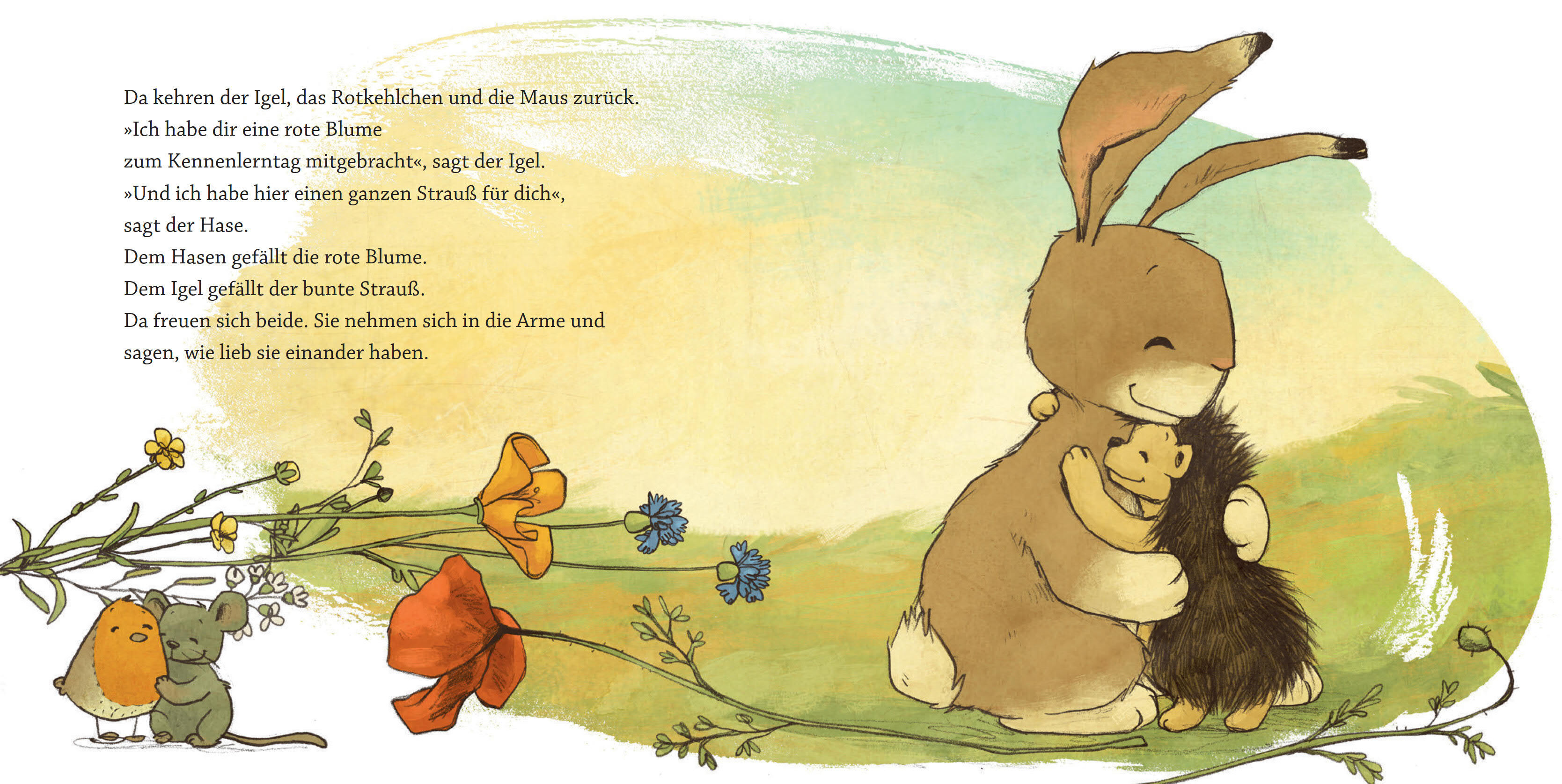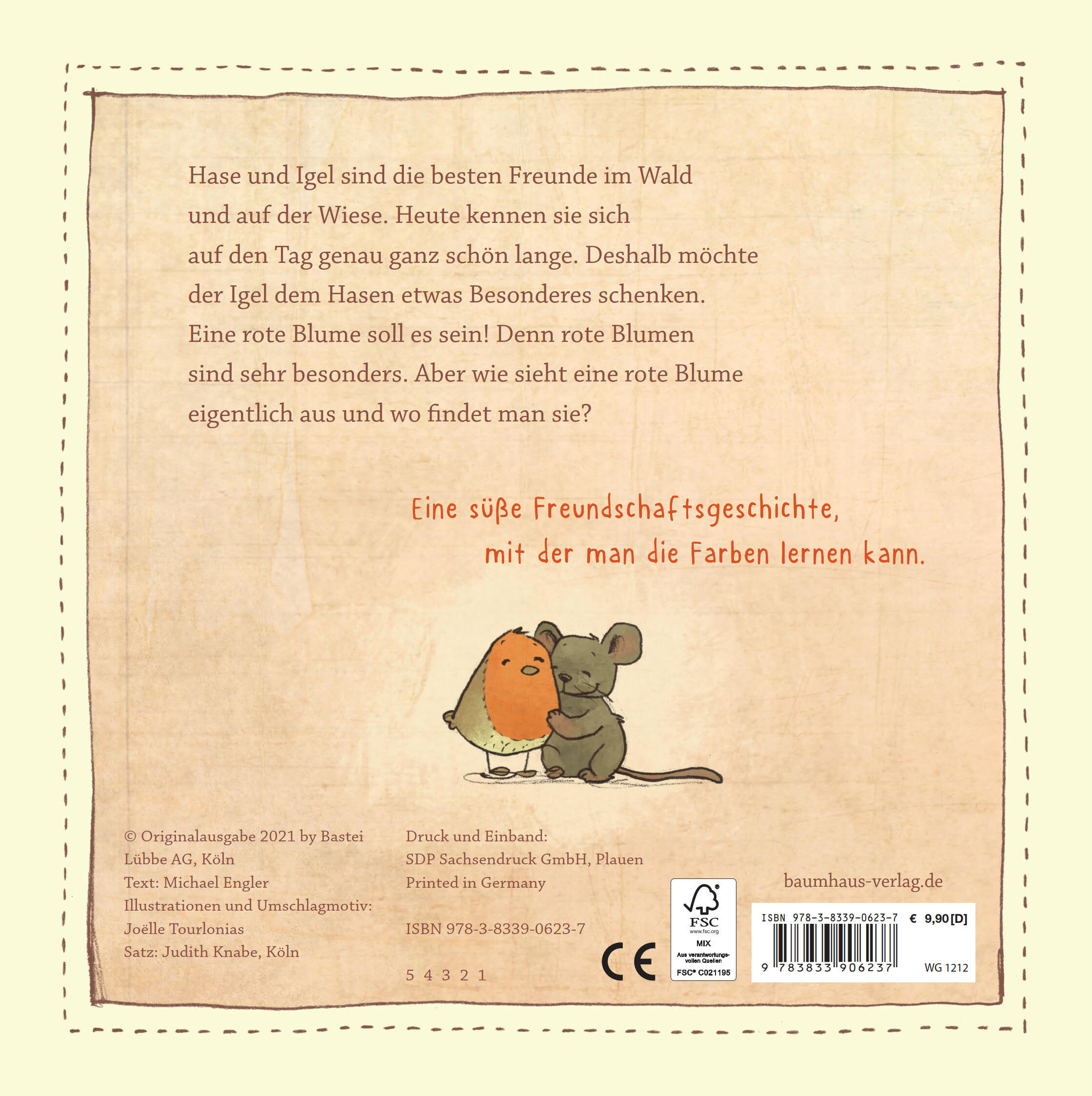 Hase und Igel sind die besten Freunde und kennen sich heute auf den Tag genau ganz schön lange. Deshalb möchte der Igel dem Hasen etwas Besonderes schenken. Eine rote Blume soll es sein! So sucht und findet er: Blumen so gelb wie die Sonne, so weiß wie Schnee...