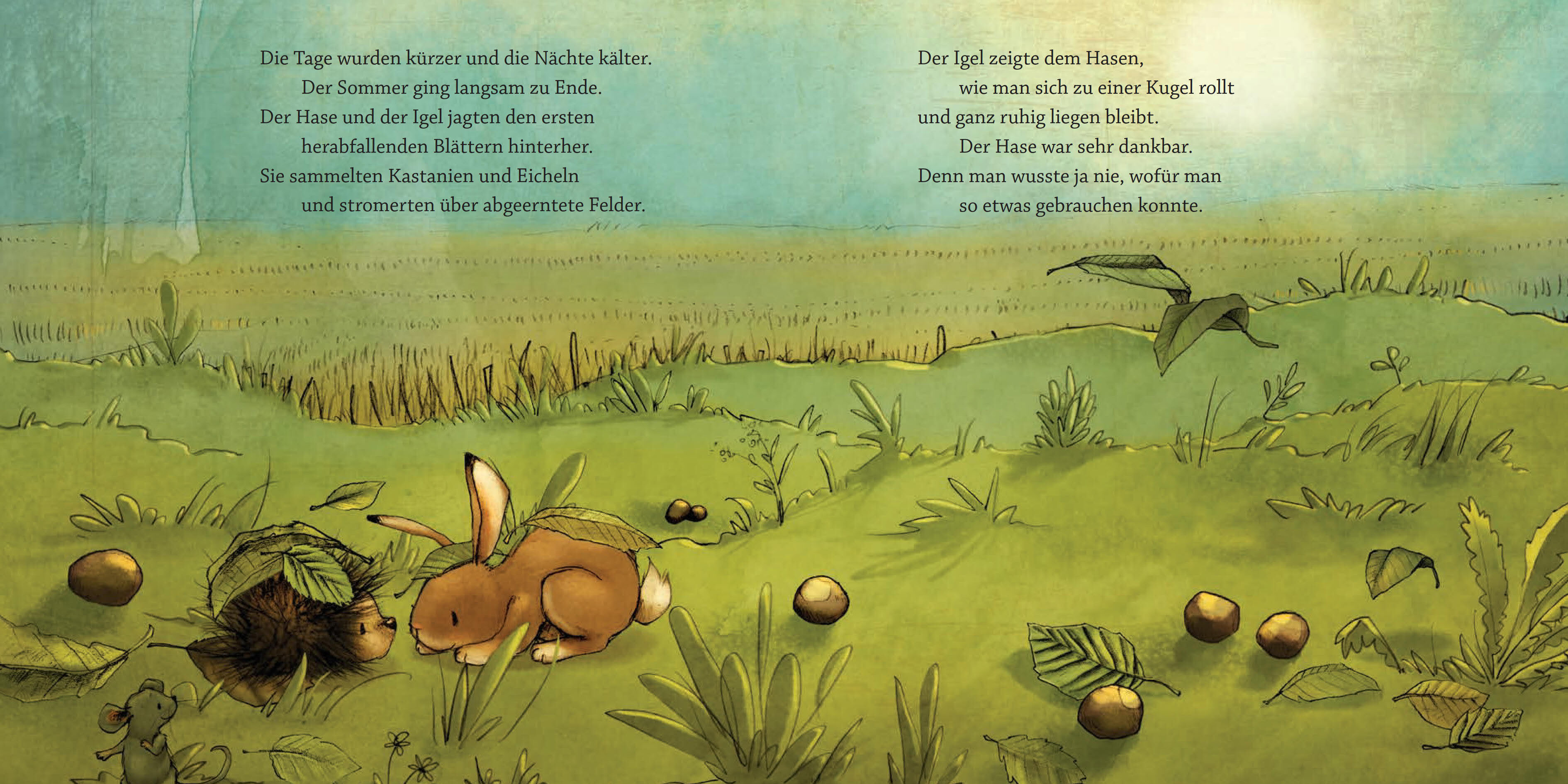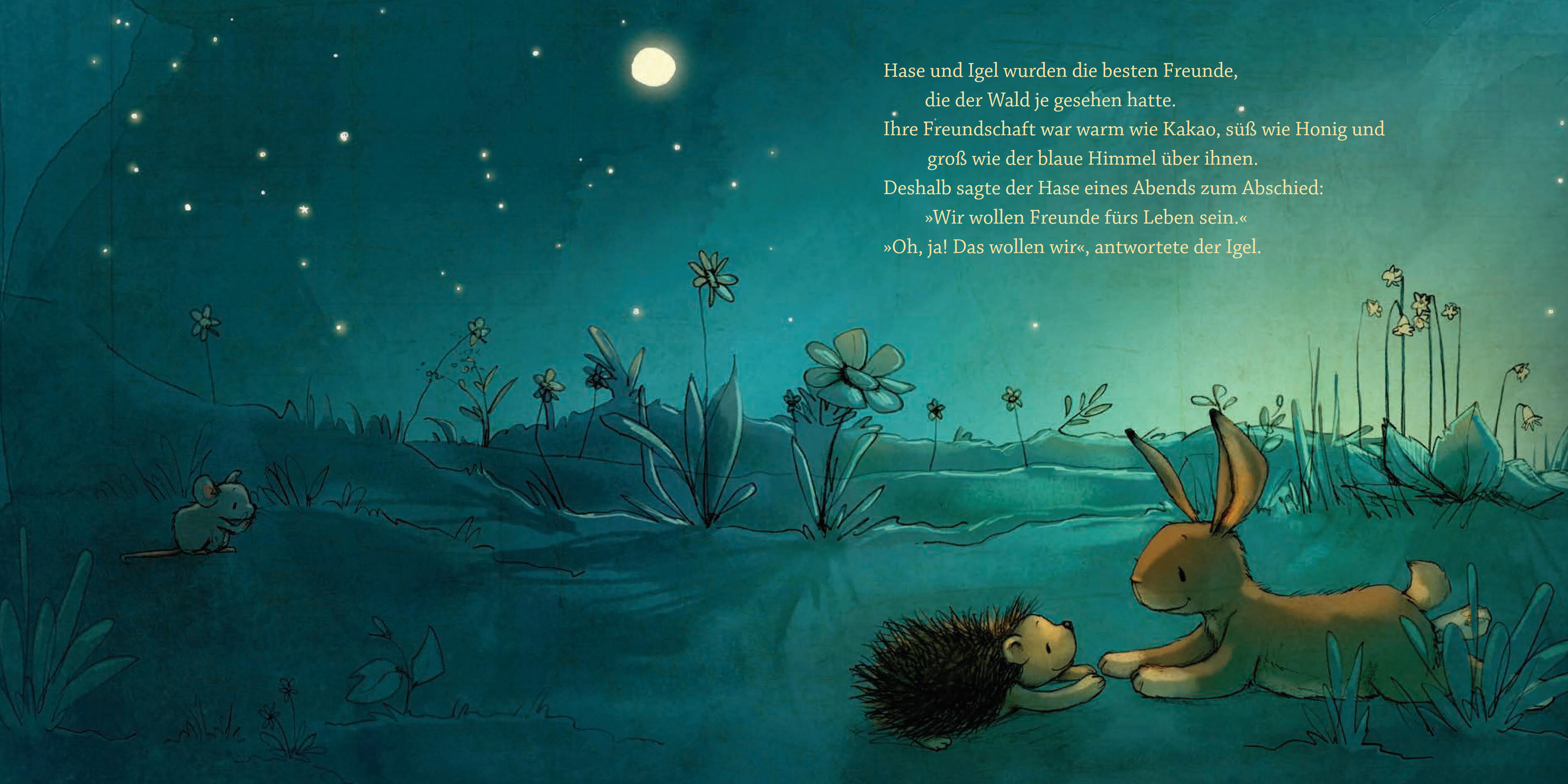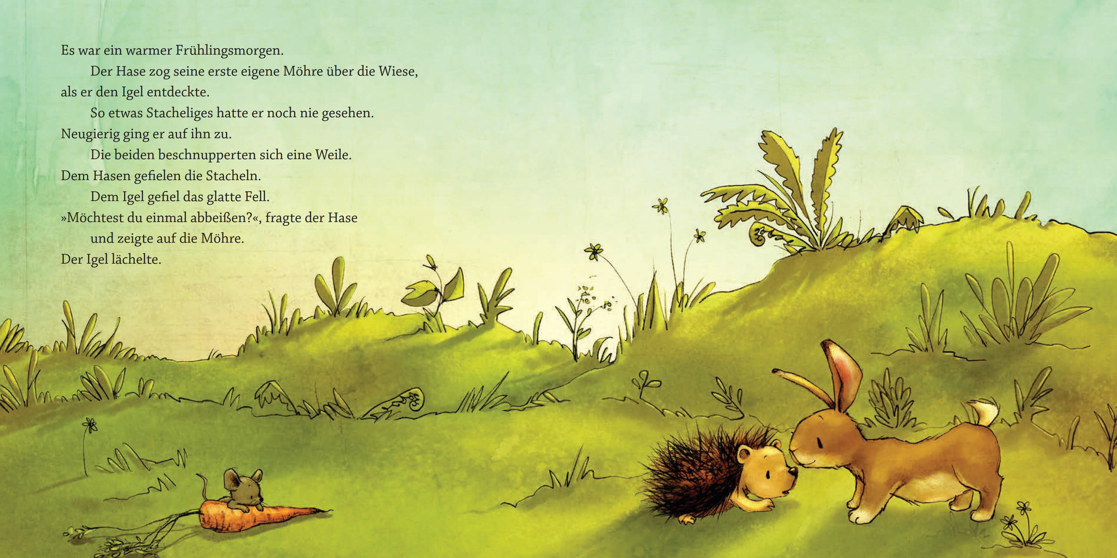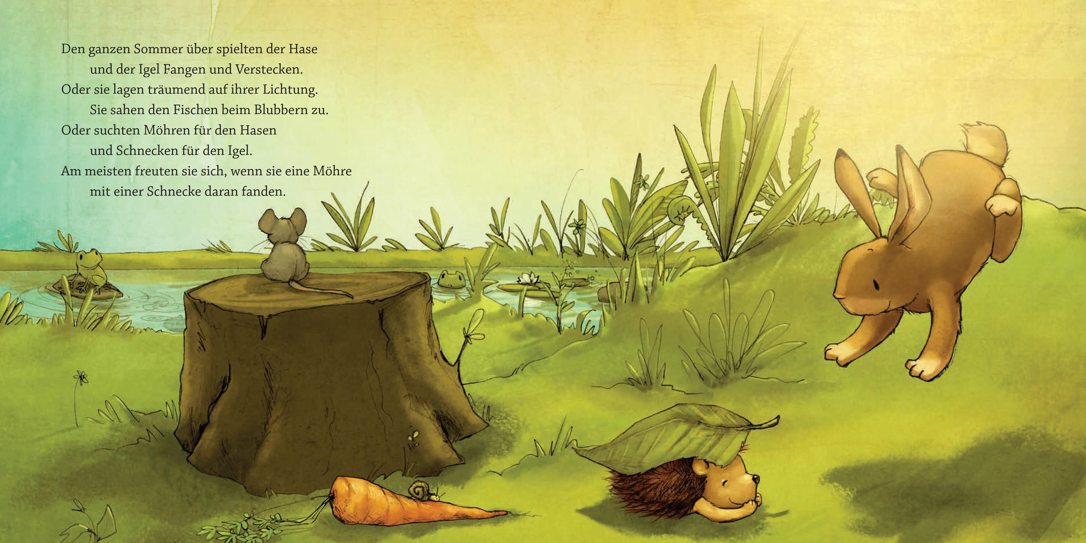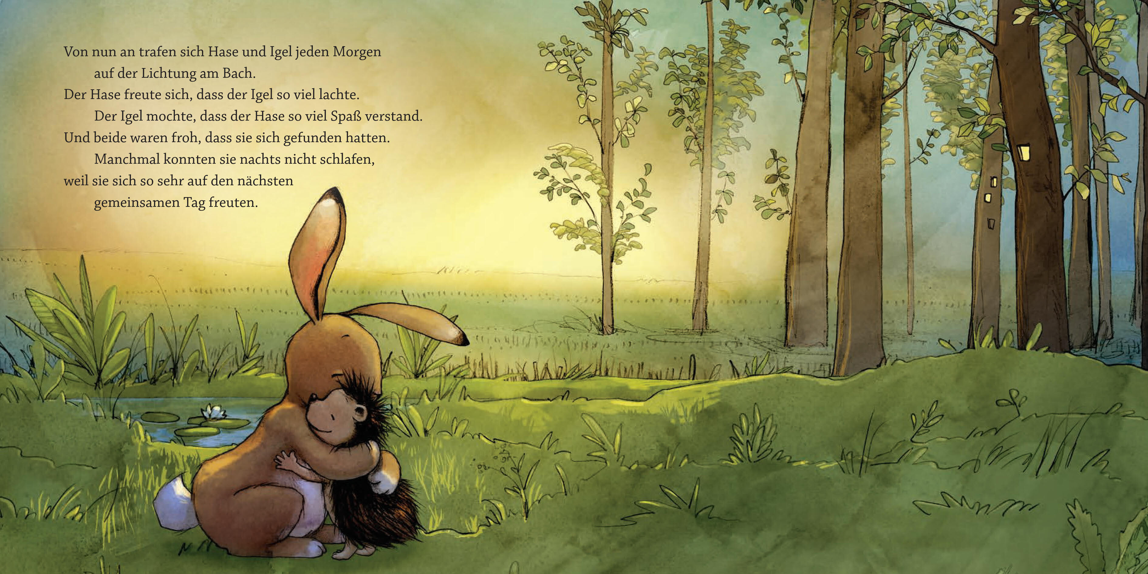 An einem warmen Frühlingsmorgen entdeckt der Hase den Igel. Ihm gefallen die Stacheln des Igels. Und dem Igel gefällt das weiche Fell des Hasen. Von nun an treffen sich die beiden jeden Morgen an der Lichtung am Bach. Doch eines Tages ist der Igel verschwunde...