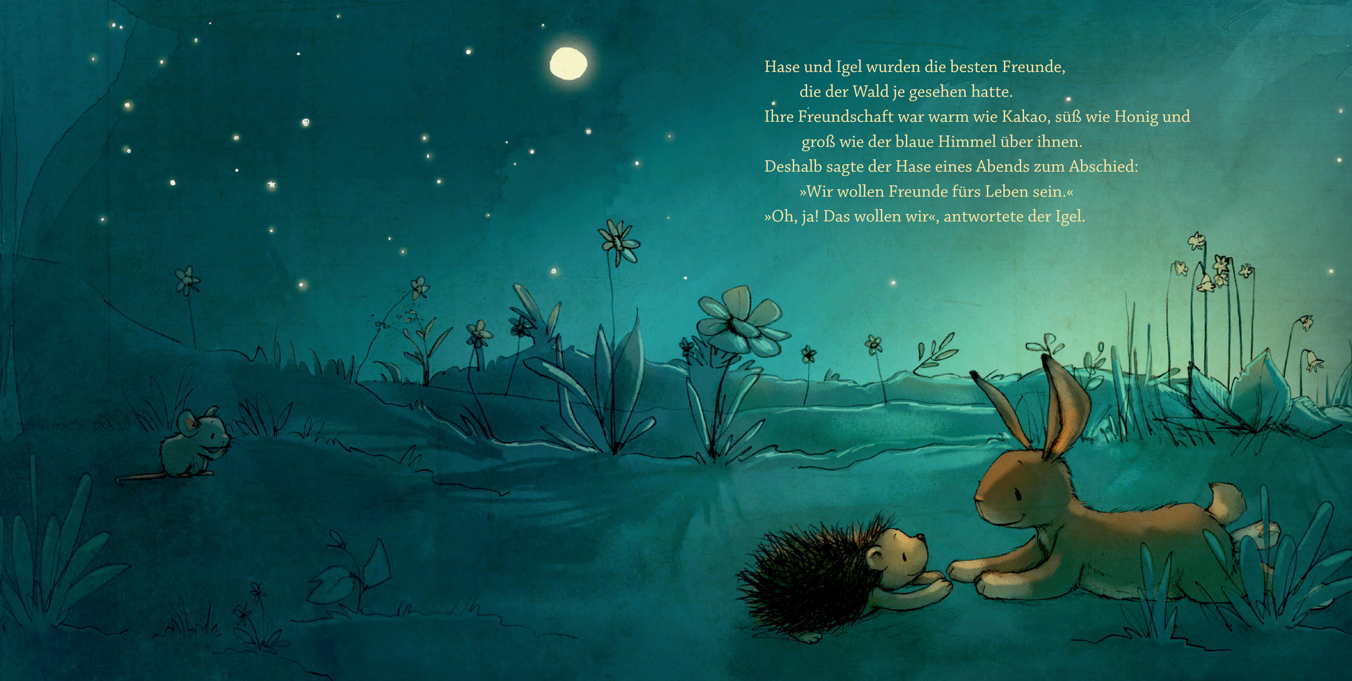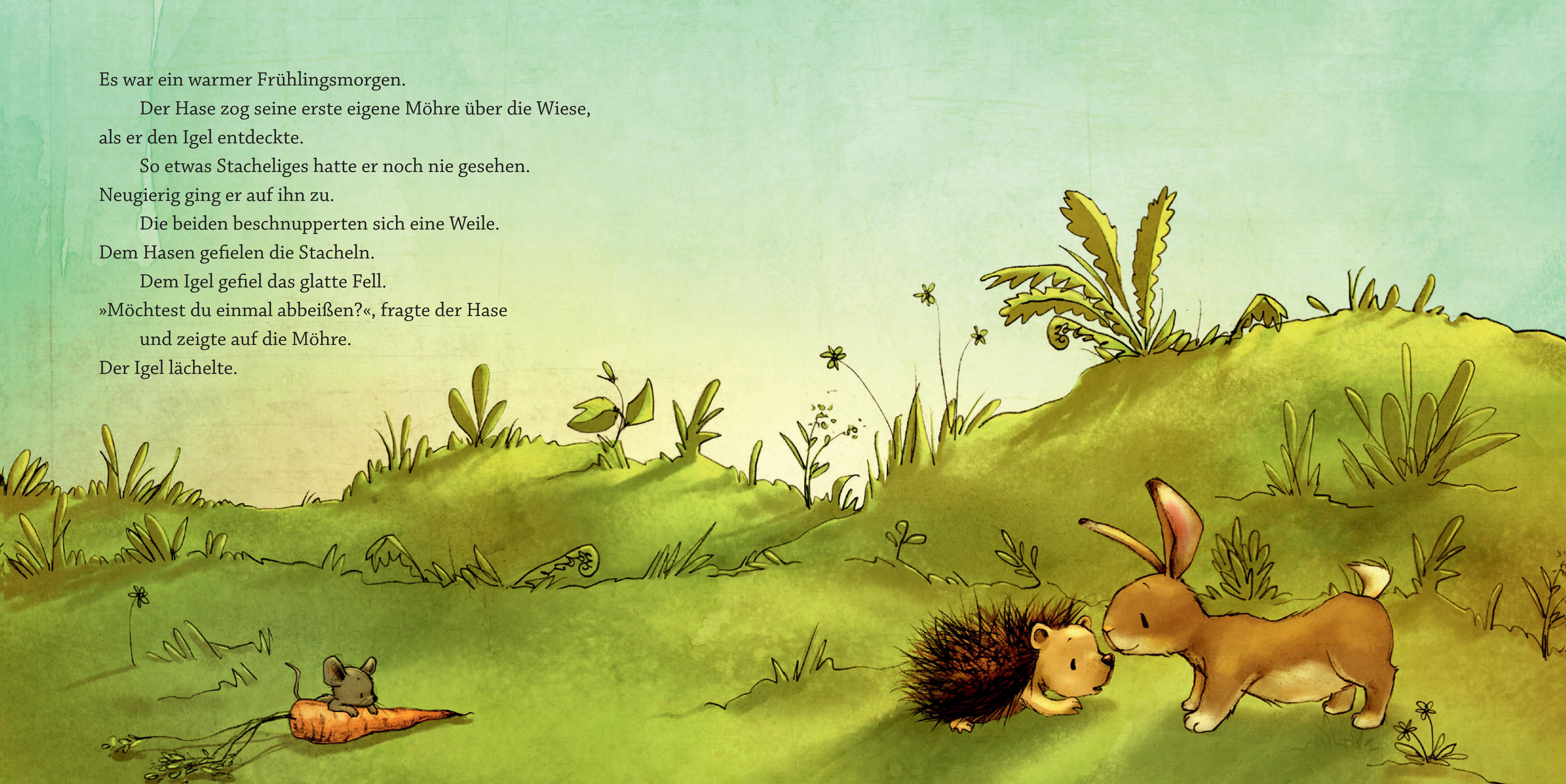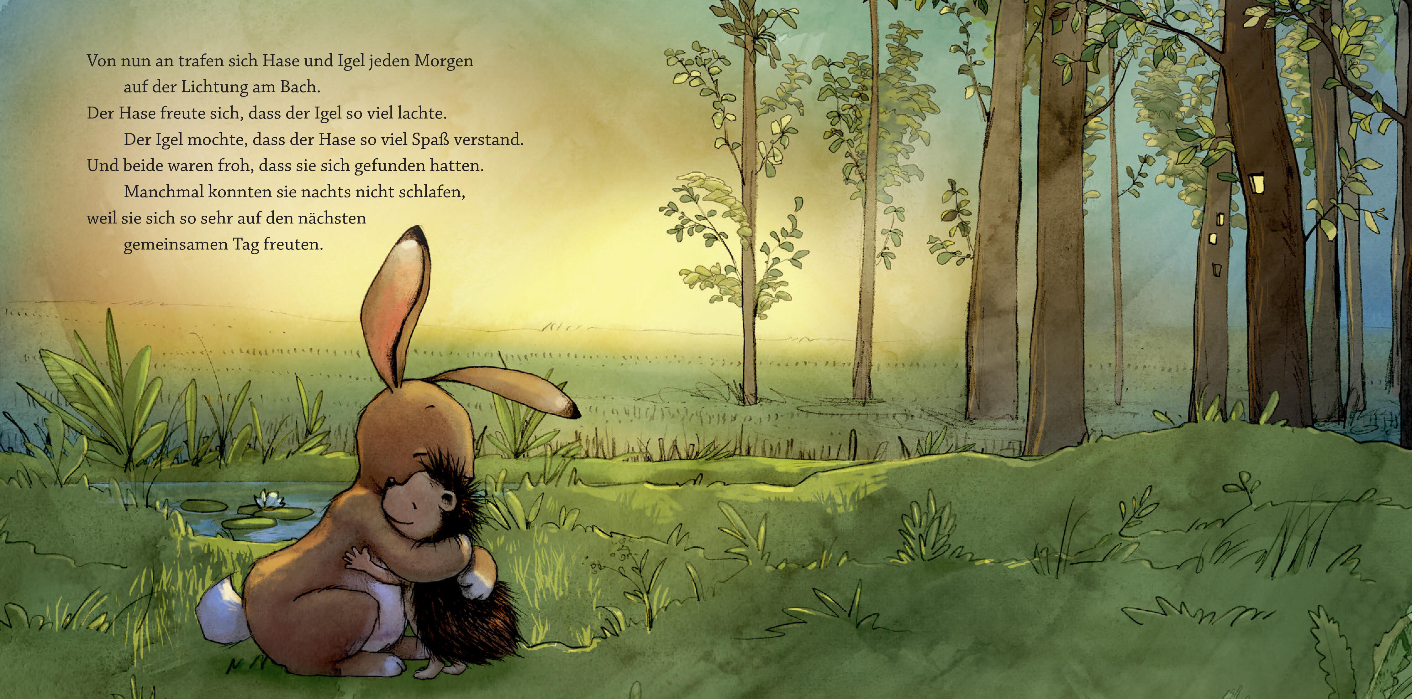 An einem warmen Frühlingsmorgen entdeckt der Hase den Igel. Ihm gefallen die Stacheln des Igels. Und dem Igel gefällt das weiche Fell des Hasen. Von nun an treffen sich die beiden jeden Morgen an der Lichtung am Bach. Doch eines Tages ist der Igel verschwunde...