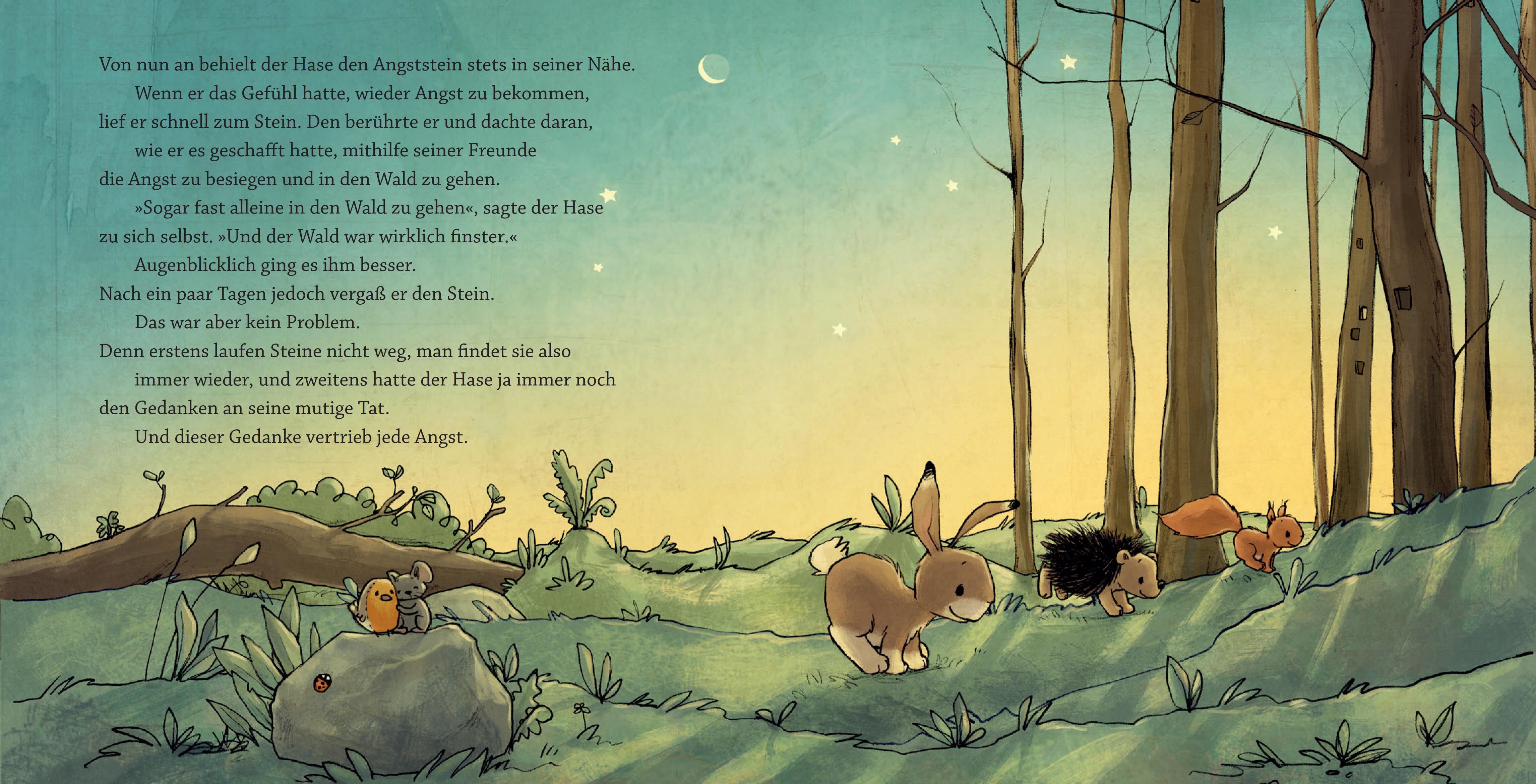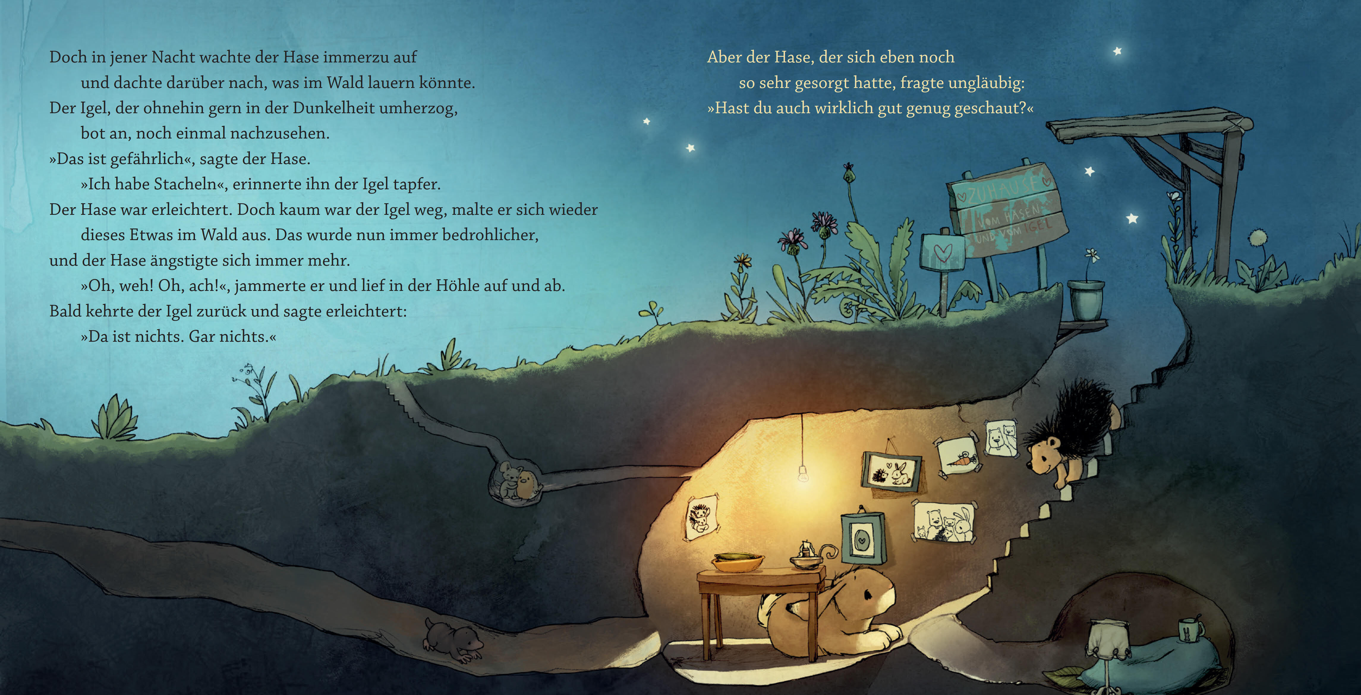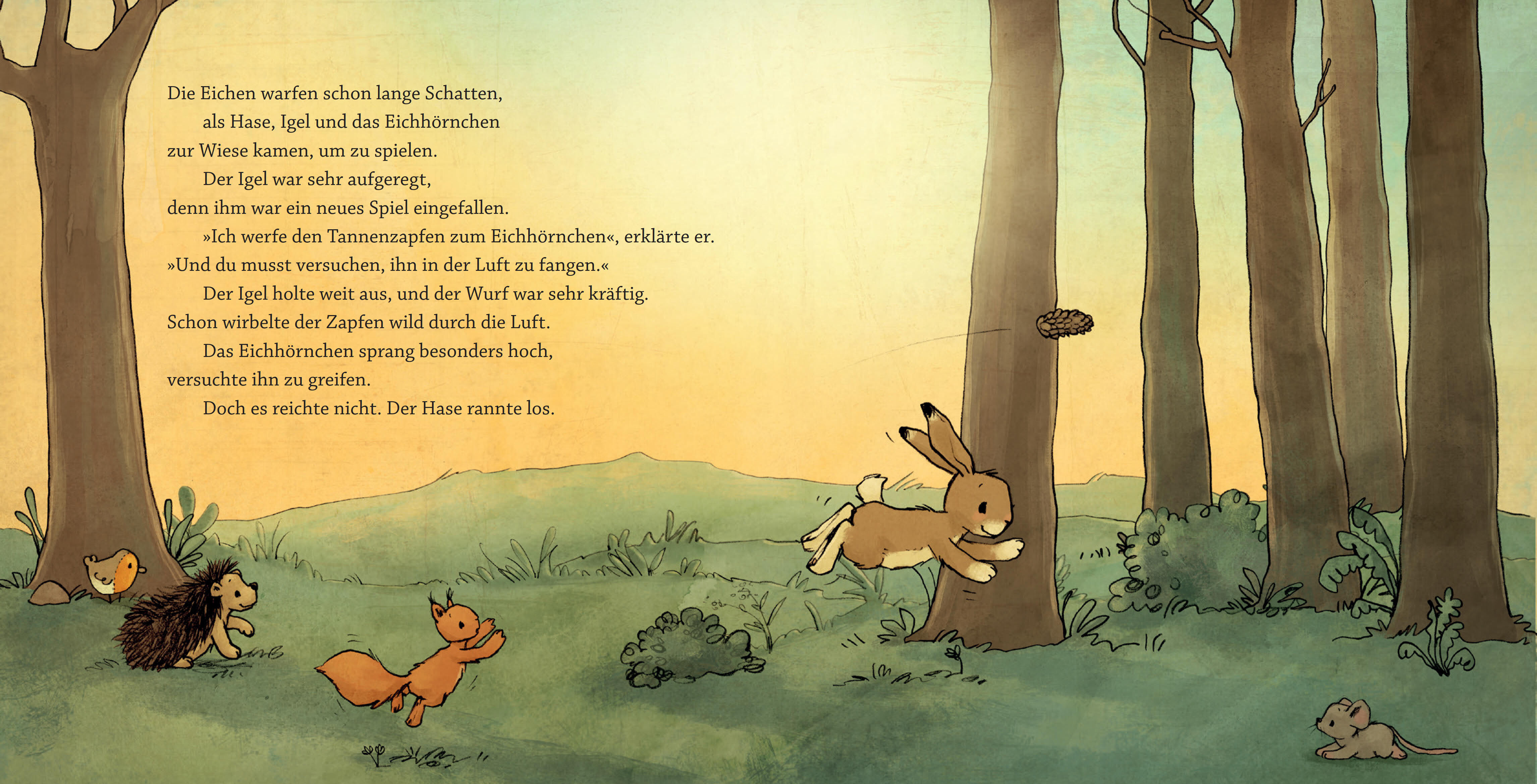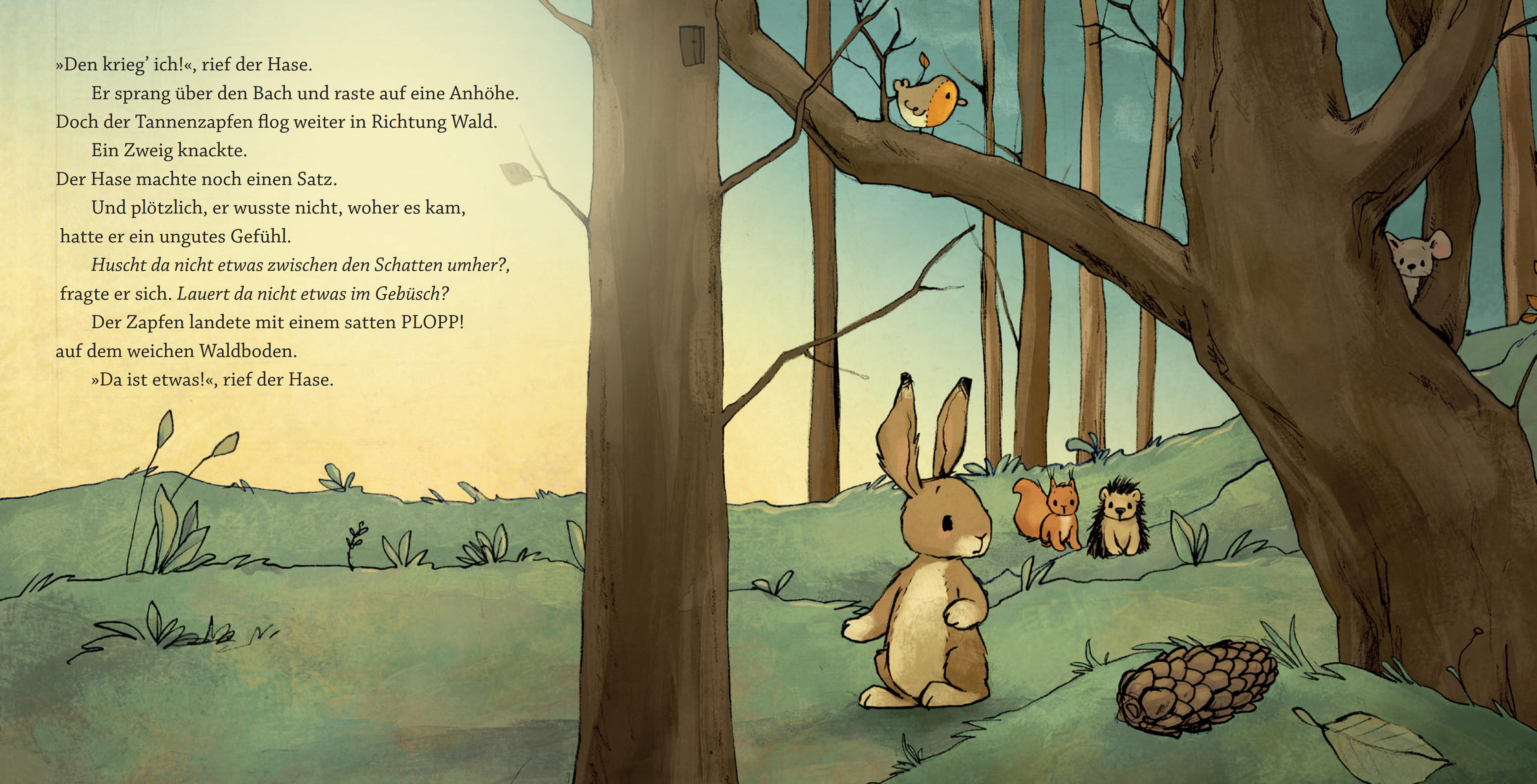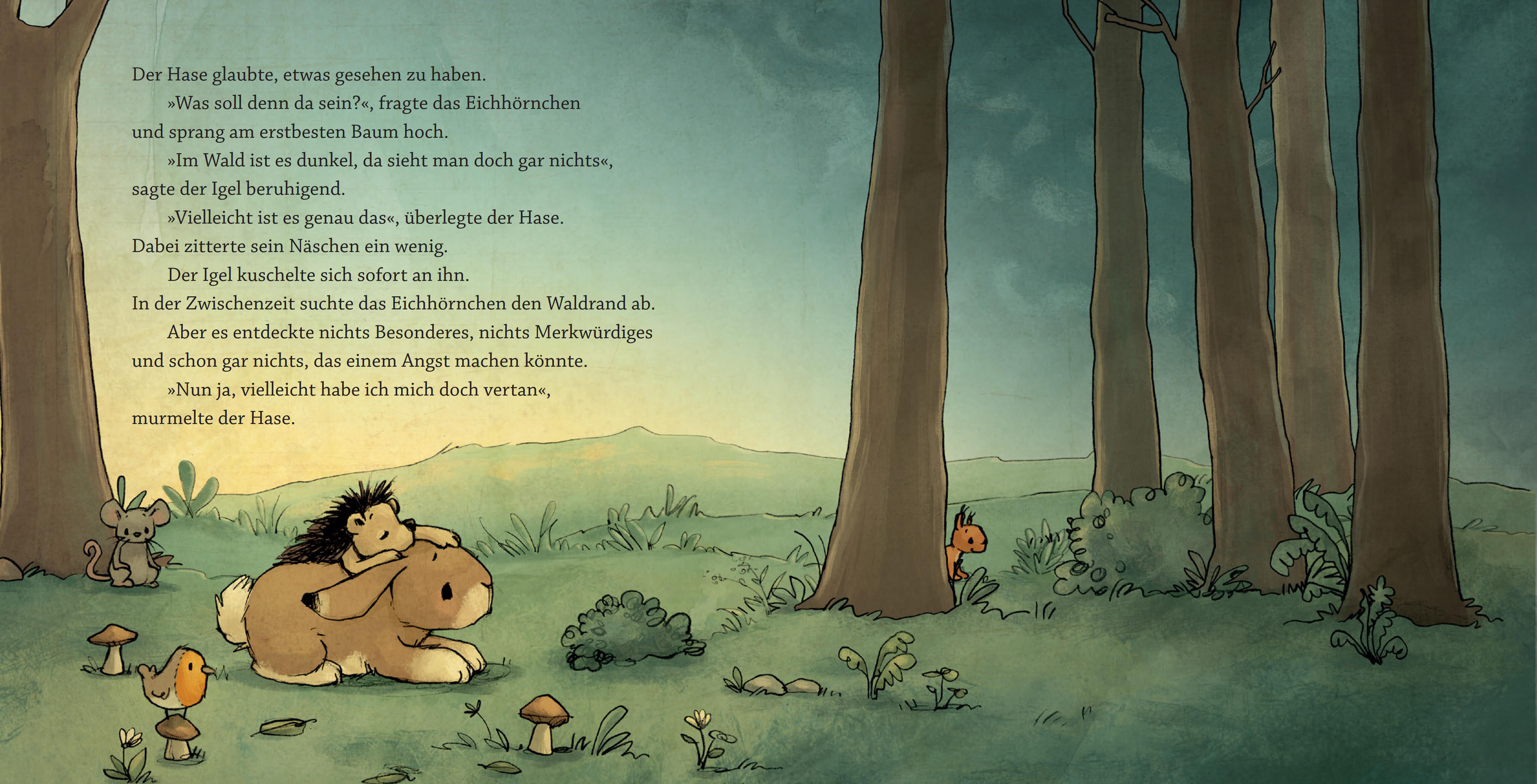 Die Eichen werfen schon lange Schatten, als der Hase beim Spielen plötzlich ein ungutes Gefühl bekommt. Lauert da nicht etwas im Gebüsch? Der Igel und das Eichhörnchen können nichts Merkwürdiges entdecken, dennoch schläft der Hase fortan schlecht und hat zu n...