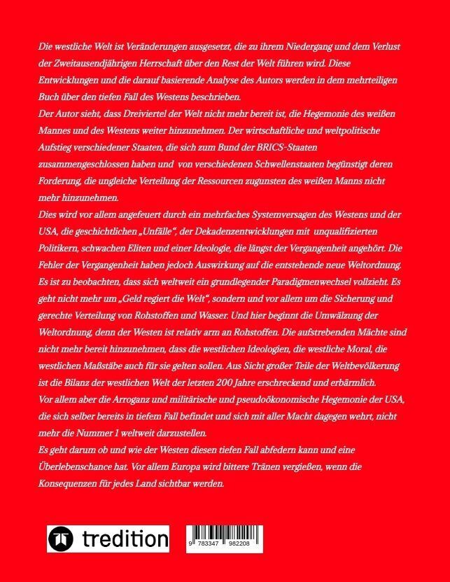 Die westliche Welt ist Veränderungen ausgesetzt ist, die zu ihrem Niedergang und dem Verlust der Zweitausendjährigen Herrschaft über den Rest der Welt führen wird. Diese Entwicklungen und die darauf basierende Analyse des Autors werden in dem mehrteiligen Buch...