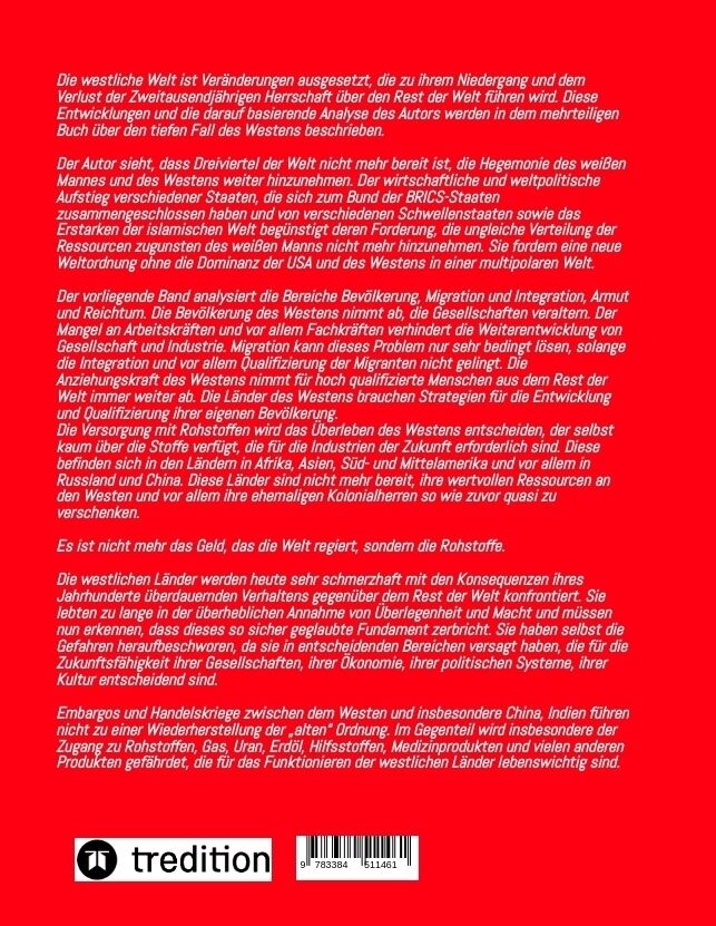Die westliche Welt ist Veränderungen ausgesetzt, die zu ihrem Niedergang und dem Verlust der Zweitausendjährigen Herrschaft über den Rest der Welt führen wird. Diese Entwicklungen und die darauf basierende Analyse des Autors werden in dem mehrteiligen Buch übe...