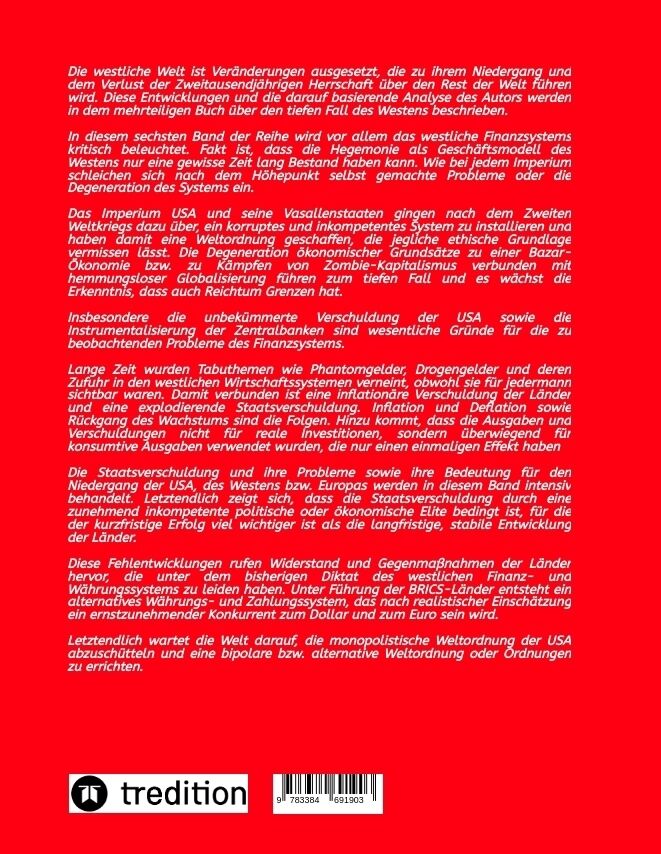 Die westliche Welt ist Veränderungen ausgesetzt, die zu ihrem Niedergang und dem Verlust der Zweitausendjährigen Herrschaft über den Rest der Welt führen wird. Diese Entwicklungen und die darauf basierende Analyse des Autors werden in dem mehrteiligen Buch übe...