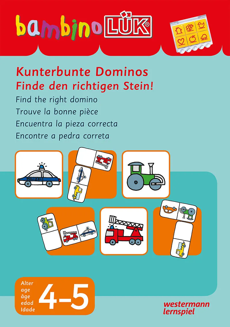 Finde den richtigen Stein! lautet das Motto des fröhlichen bambinoLÜK-Übungsheftes Kunterbunte Dominos . Alles dreht sich um die bekannten Spielsteine ? finde dieselben oder ergänze den passenden! Elf lustig illustrierte Übungen für kleine Adleraugen ab 4 Jah...