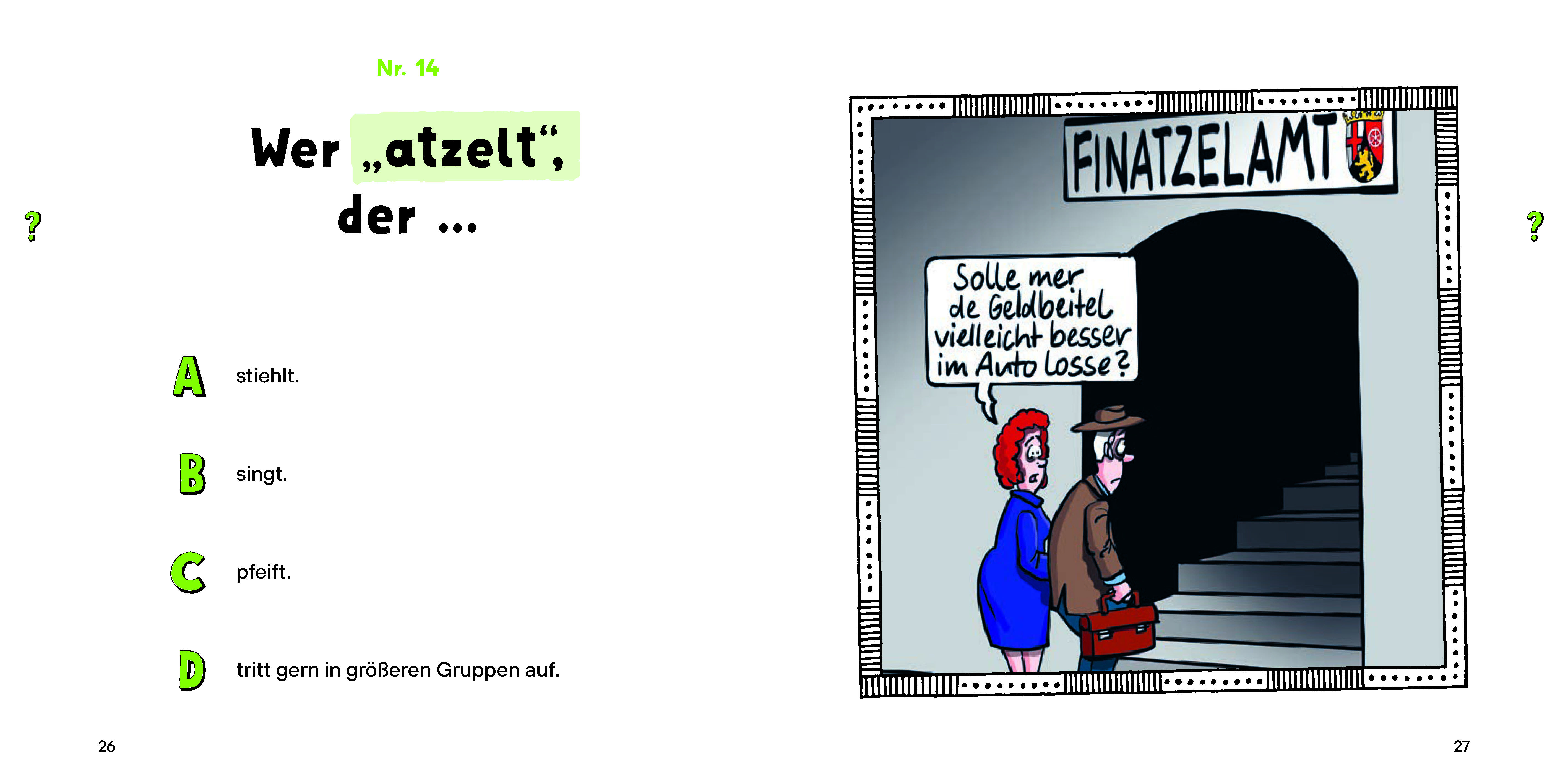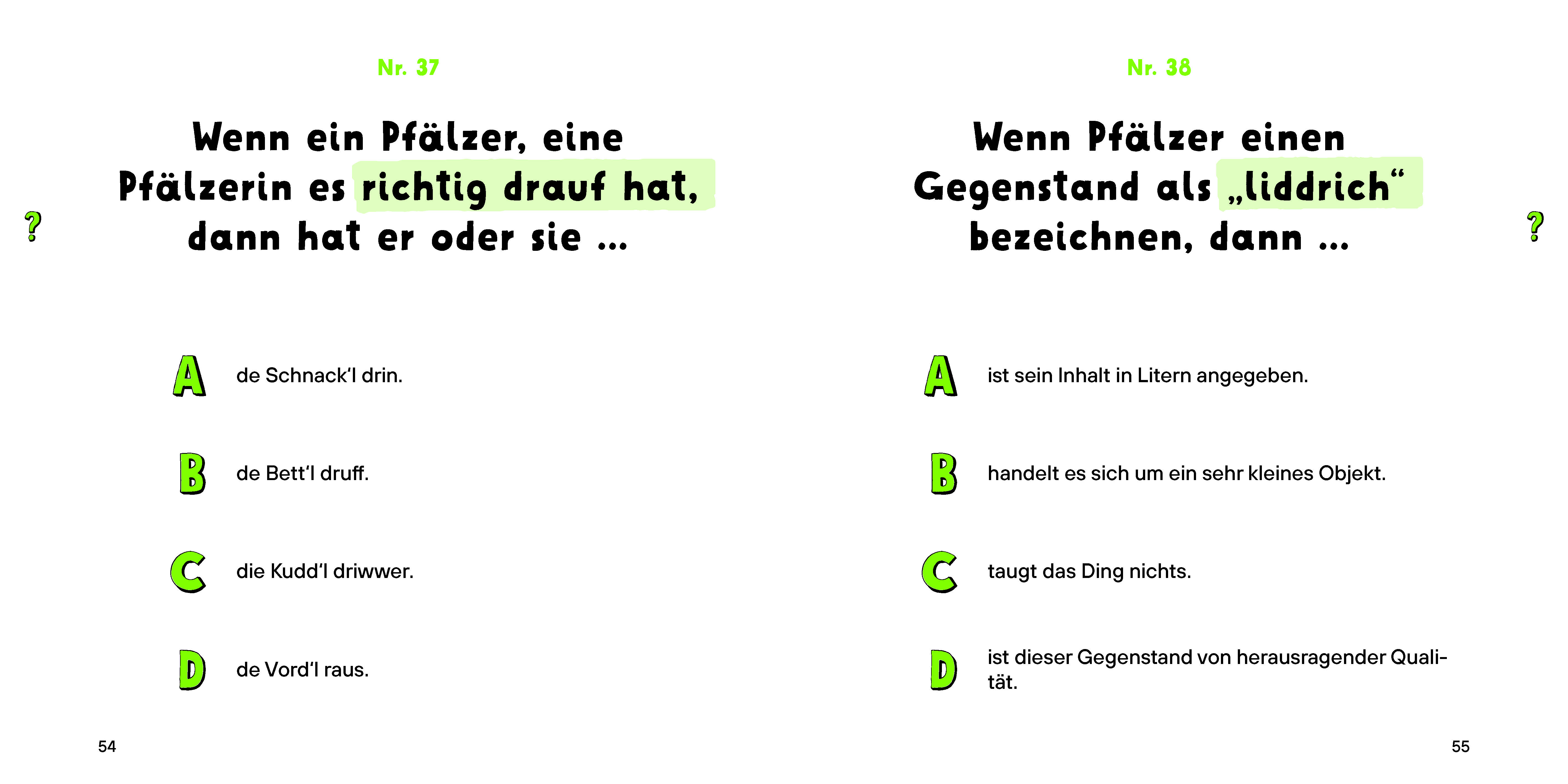 Testen Sie Ihr Pfälzisch mit 50 originellen Fragen und uber 200 trickreichen Antworten. Mit 17 Karikaturen von Uwe Herrmann. Im Antwort-Teil finden Sie alle Lösungen und Erklärungen rund um den Dialekt der Pfälzerinnen und Pfälzer sowie eine persönliche Auswer...