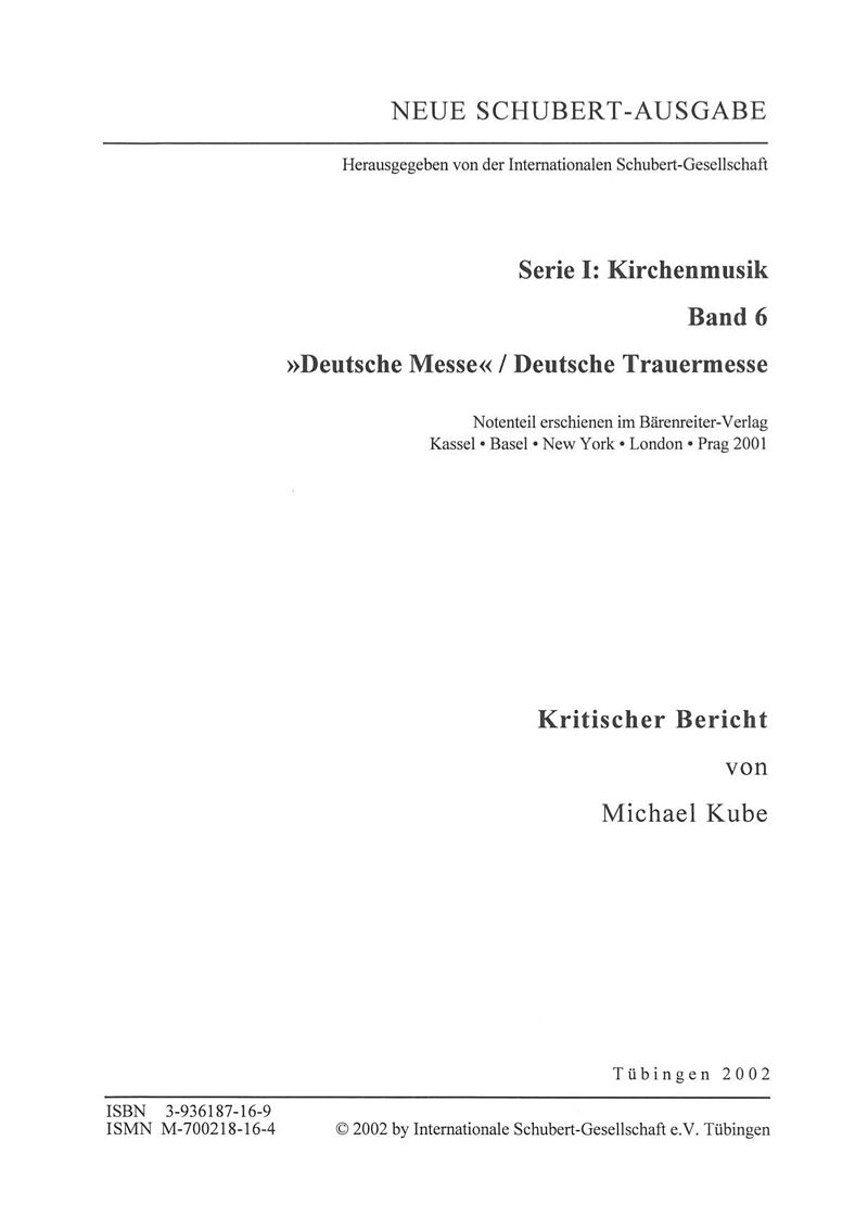 Neue Schubert-Ausgabe. Kritische Berichte / Kirchenmusik / »Deutsche Messe«, Deutsche Trauermesse