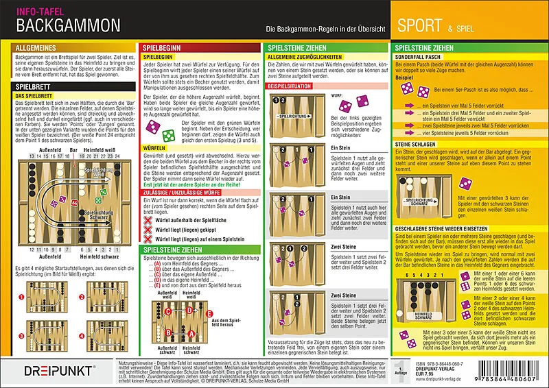Backgammon ist eines der ältesten Brettspiele! Es zeichnet sich durch einfache und leicht erlernbare Regeln und einen hohen Spielspaß aus. Backgammon- Partien hängen sowohl vom Zufall (Würfel) als auch vom strategischen Vorgehen des Spielers ab. Von der Aufste...