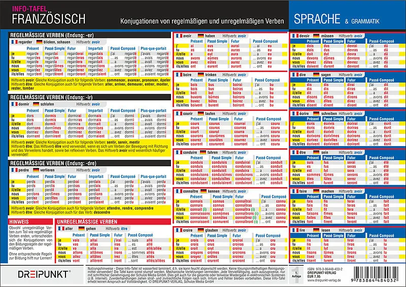 Die französischen Verben unterteilen sich in regelmäßige und unregelmäßige Verben. Während sich die Konjugation regelmäßiger Verben an klare und nachvollziehbare Regeln hält, müssen unregelmäßige Verben in der Regel gelernt werden. Mit dieser laminierten Info-...
