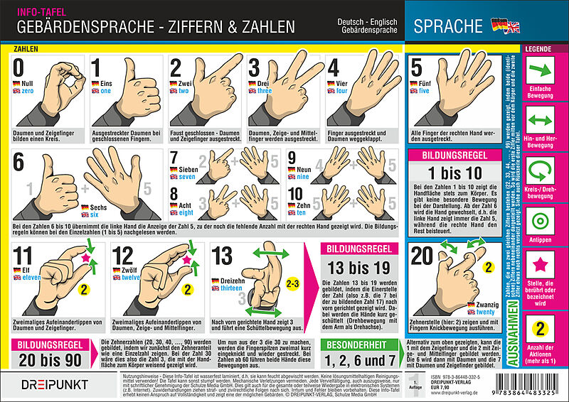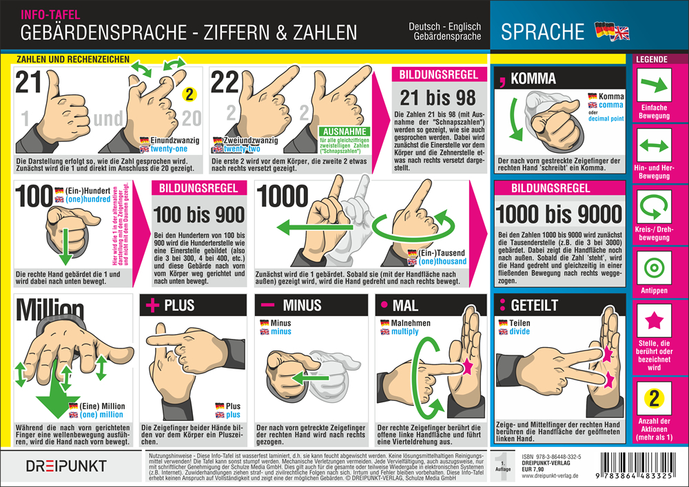 Die Darstellung der Ziffern und Zahlen in der Deutschen Gebärdensprache (DGS) ist verhältnismäßig komplex. So werden unterschiedliche Bildungsregeln für die Darstellung herangezogen, je nachdem, in welchem Zahlenbereich wir uns bewegen. In klaren großen Bilder...