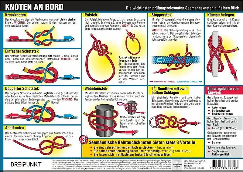 Alle wichtigen Seemannsknoten auf einen Blick. Ideal zum Üben. Auf dieser laminierten Info-Tafel finden Sie die wichtigsten an Bord benötigten Seemannsknoten in klaren, leicht nachvollziehbaren Darstellungen. Mit Einsatzgebieten und kleiner Knotenkunde. Diese ...