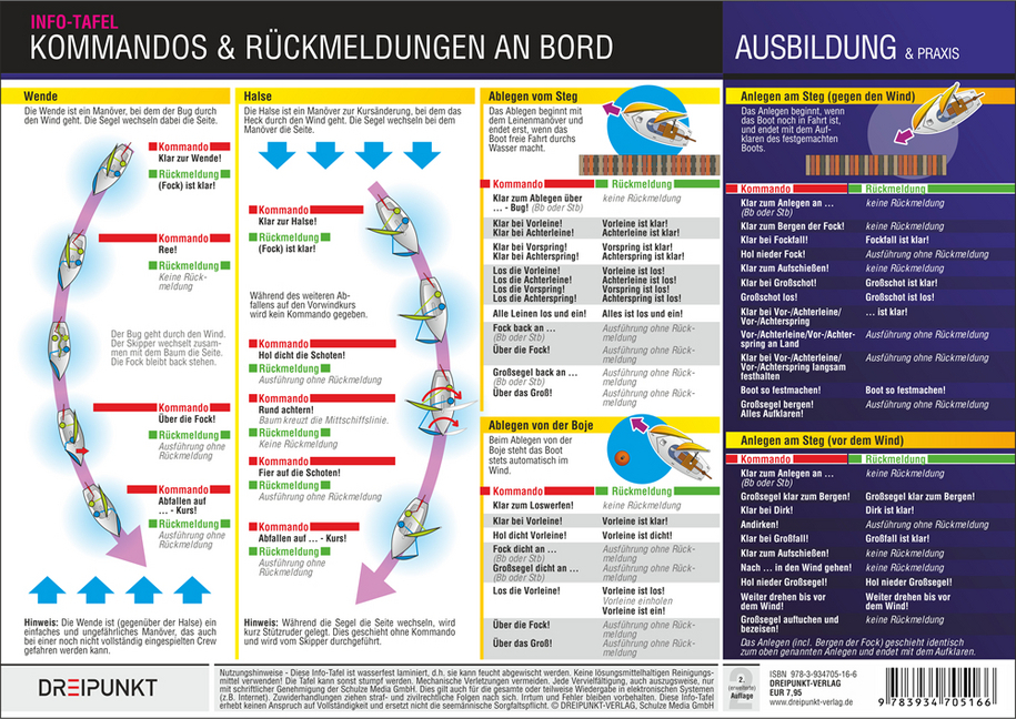 Alle relevanten Kommandos an Bord inklusive der korrekten Rückmeldungen Auf dieser laminierten Info-Tafel finden Sie die korrekten Kommandos und die erforderlichen Rückmeldungen für alle wichtigen Manöver im Hafen und auf See. Kommandos gehören nicht nur zum P...