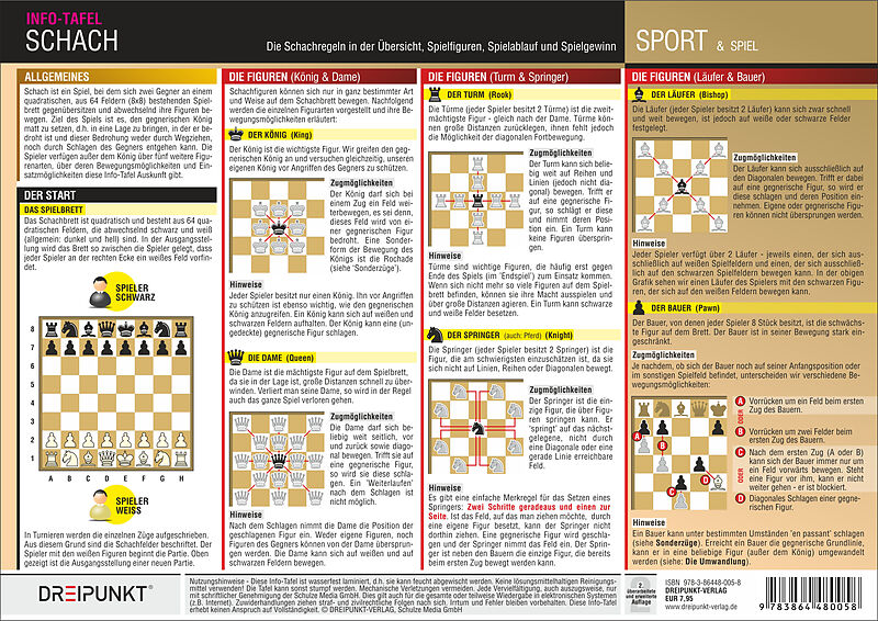 Mit dieser Info-Tafel erhalten Sie eine Übersicht aller Regeln zum Erlernen des Spiels der Könige. Neben der genauen Beschreibung aller Figuren und deren Bewegungsmöglichkeiten werden Sonderzüge und Figurenumwandlungen bebildert dargestellt. Der Spielablauf wi...