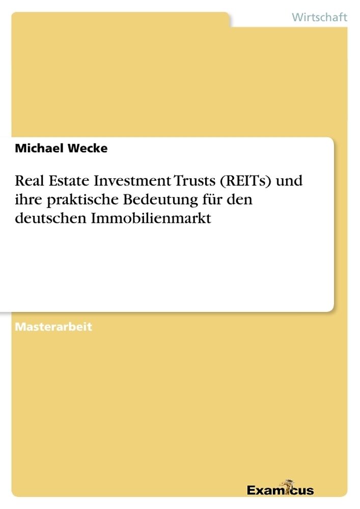 Masterarbeit aus dem Jahr 2004 im Fachbereich BWL - Bank, Börse, Versicherung, Note: 1.7, HBC Hochschule Biberach. University of Applied Sciences, Sprache: Deutsch, Abstract: Die Arbeit befasst sich mit dem Thema der Real Estate Investment Trusts. Sie gewährt ...